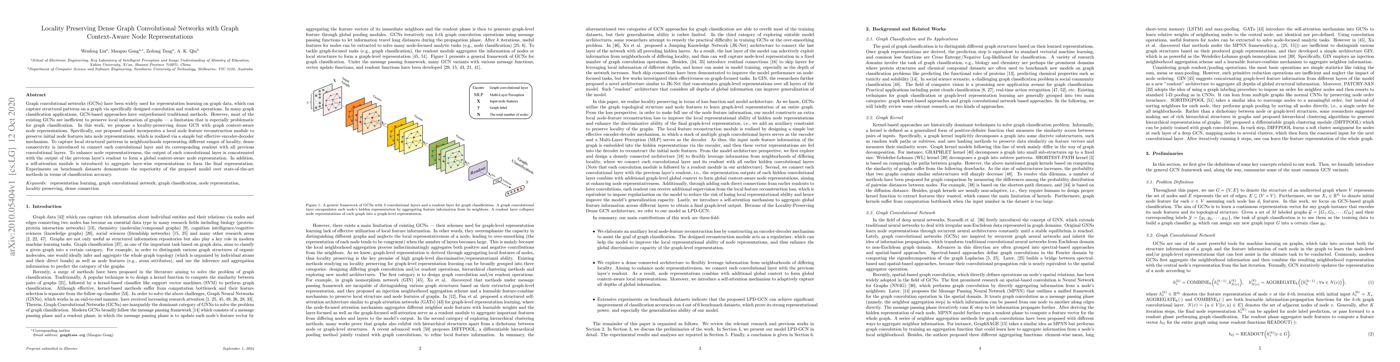 This paper proposes a locality-preserving dense graph convolutional network (GCN) that enhances node representations by incorporating local feature reconstruction and dense connectivity to capture local structural patterns. The model also uses context-aware node representations and self-attention to improve classification accuracy, outperforming state-of-the-art methods on benchmark datasets.