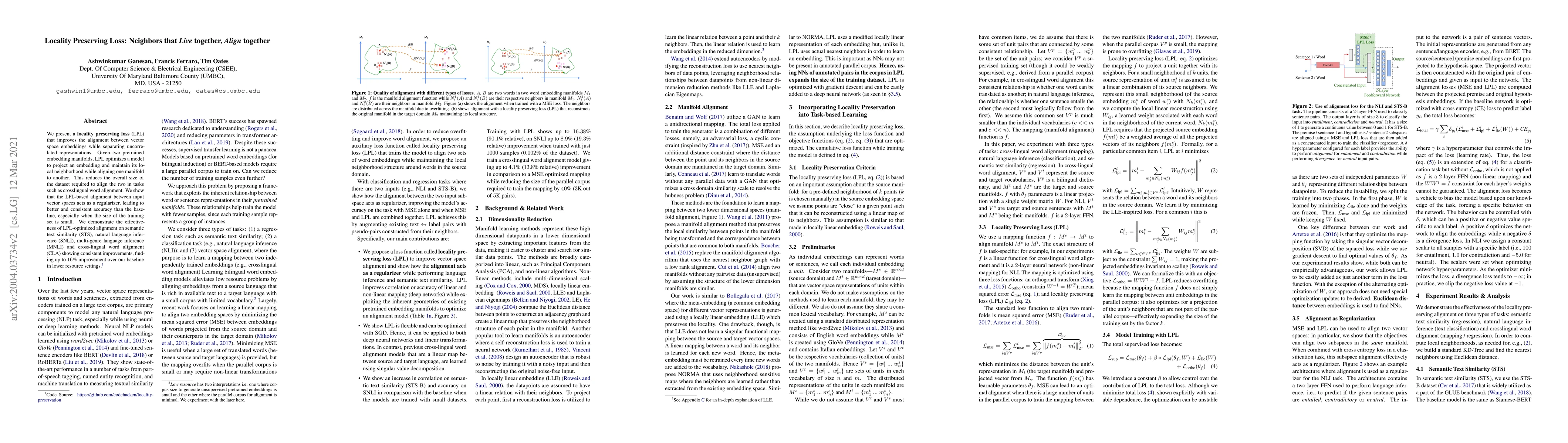 We present a locality preserving loss (LPL) that improves the alignment between vector space embeddings while separating uncorrelated representations. Given two pretrained embedding manifolds, LPL optimizes a model to project an embedding and maintain its local neighborhood while aligning one manifold to another. This reduces the overall size of the dataset required to align the two in tasks such as cross-lingual word alignment. We show that the LPL-based alignment between input vector spaces acts as a regularizer, leading to better and consistent accuracy than the baseline, especially when the size of the training set is small. We demonstrate the effectiveness of LPL optimized alignment on semantic text similarity (STS), natural language inference (SNLI), multi-genre language inference (MNLI) and cross-lingual word alignment(CLA) showing consistent improvements, finding up to 16% improvement over our baseline in lower resource settings.