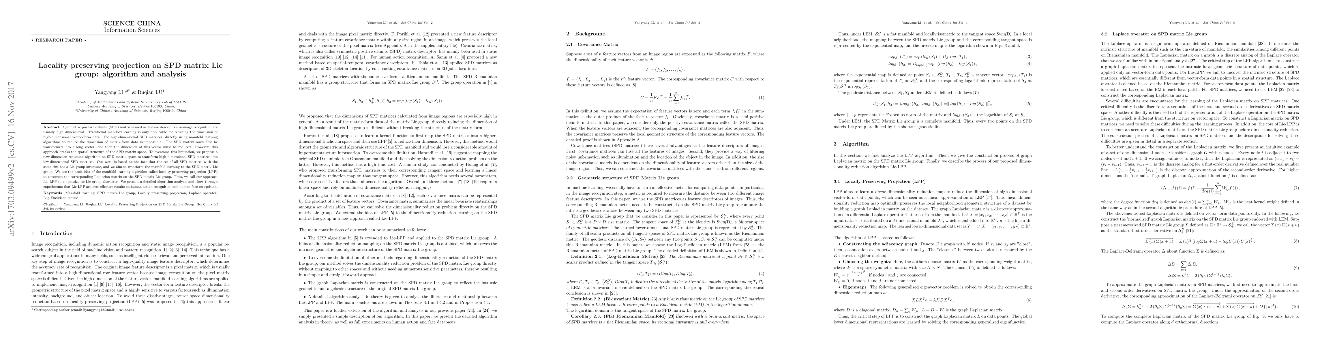This paper proposes a new dimension reduction algorithm called Lie-LPP for high-dimensional symmetric positive definite (SPD) matrices used in image recognition. It transforms SPD matrices into low-dimensional forms while preserving their spatial structure, leveraging the Lie group structure of SPD matrices and the locality preserving projection method. Experimental results show effective performance in human action and face recognition tasks.