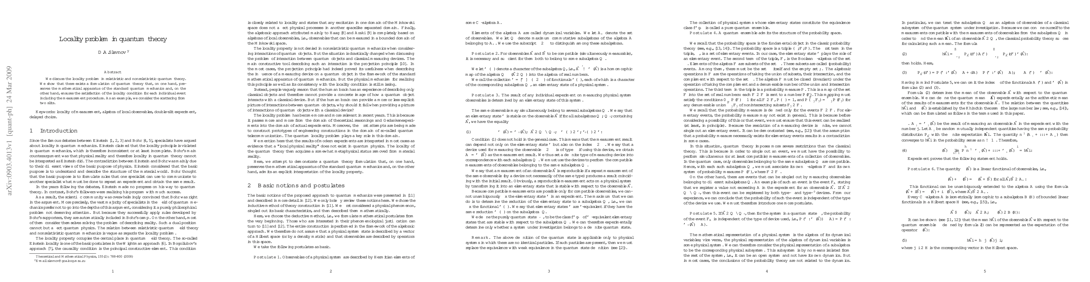 The paper discusses the locality problem in relativistic and nonrelativistic quantum theory, proposing a formulation that preserves standard quantum mechanics while ensuring locality for individual events, including measurement procedures. The example of scattering from two slits is used to illustrate this.