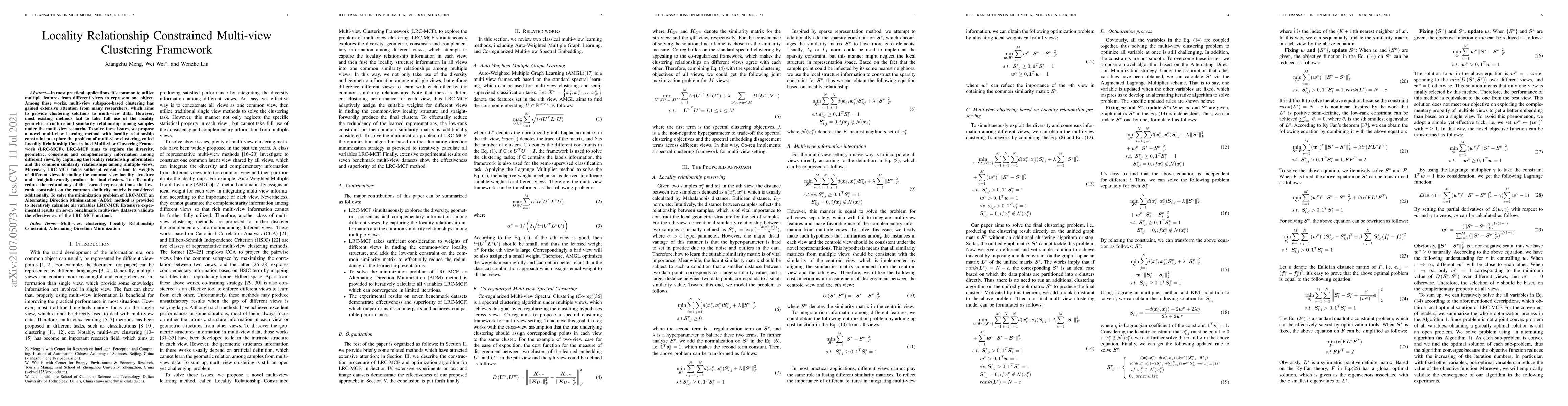 The paper proposes a novel Locality Relationship Constrained Multi-view Clustering Framework (LRC-MCF) to address the limitations of existing multi-view clustering methods by leveraging locality geometric structures and similarity relationships among samples across different views. The method effectively integrates diverse, consensus, and complementary information, utilizing an Alternating Direction Minimization (ADM) approach to solve the optimization problem and validates its effectiveness through experiments on benchmark datasets.