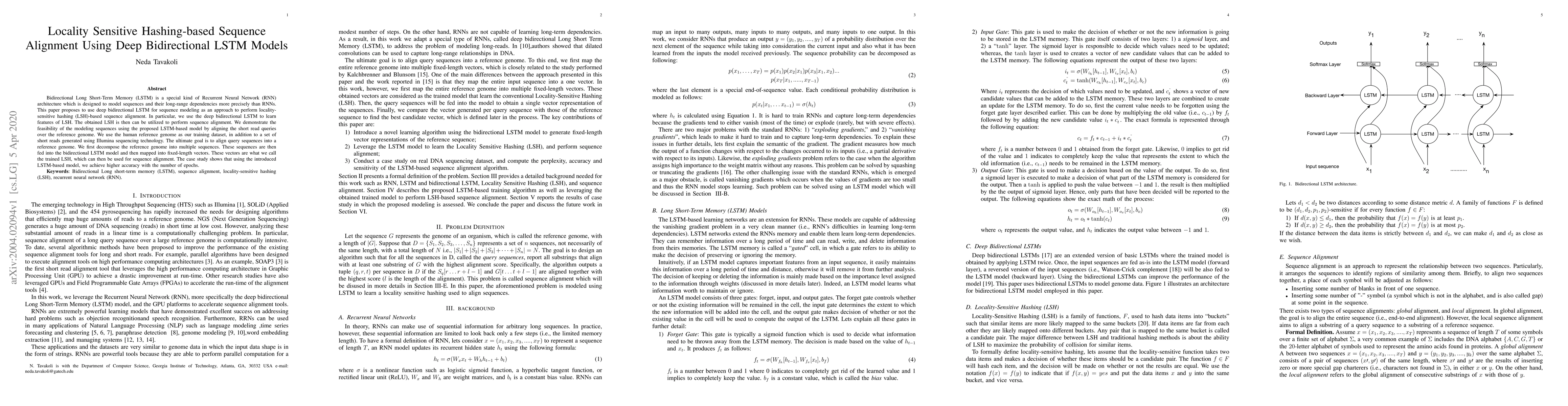 This paper proposes using deep bidirectional LSTM models to perform locality-sensitive hashing (LSH)-based sequence alignment, achieving higher accuracy by decomposing the reference genome into sequences and mapping them into fixed-length vectors. The results show improved alignment of short read queries over the human reference genome.