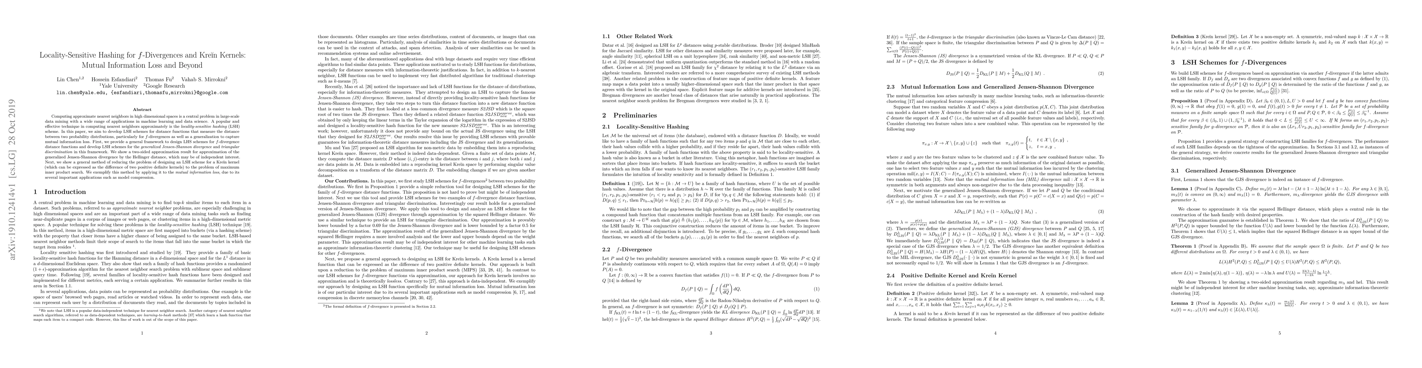 Computing approximate nearest neighbors in high dimensional spaces is a central problem in large-scale data mining with a wide range of applications in machine learning and data science. A popular and effective technique in computing nearest neighbors approximately is the locality-sensitive hashing (LSH) scheme. In this paper, we aim to develop LSH schemes for distance functions that measure the distance between two probability distributions, particularly for f-divergences as well as a generalization to capture mutual information loss. First, we provide a general framework to design LHS schemes for f-divergence distance functions and develop LSH schemes for the generalized Jensen-Shannon divergence and triangular discrimination in this framework. We show a two-sided approximation result for approximation of the generalized Jensen-Shannon divergence by the Hellinger distance, which may be of independent interest. Next, we show a general method of reducing the problem of designing an LSH scheme for a Krein kernel (which can be expressed as the difference of two positive definite kernels) to the problem of maximum inner product search. We exemplify this method by applying it to the mutual information loss, due to its several important applications such as model compression.