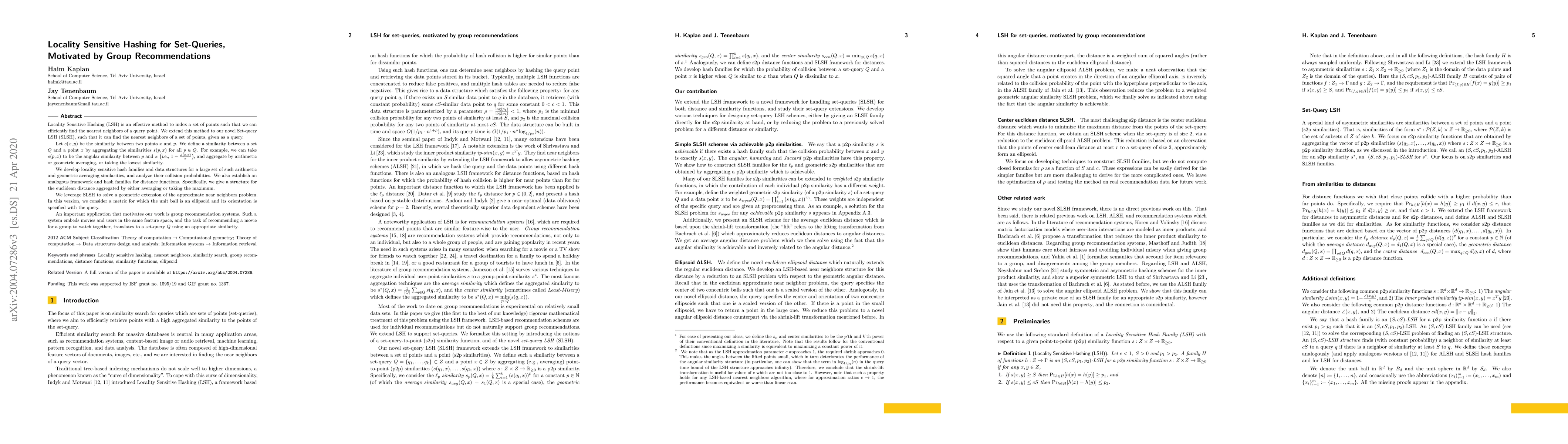 Locality Sensitive Hashing (LSH) is an effective method to index a set of points such that we can efficiently find the nearest neighbors of a query point. We extend this method to our novel Set-query LSH (SLSH), such that it can find the nearest neighbors of a set of points, given as a query. Let $ s(x,y) $ be the similarity between two points $ x $ and $ y $. We define a similarity between a set $ Q$ and a point $ x $ by aggregating the similarities $ s(p,x) $ for all $ p\in Q $. For example, we can take $ s(p,x) $ to be the angular similarity between $ p $ and $ x $ (i.e., $1-{\angle (x,p)}/{\pi}$), and aggregate by arithmetic or geometric averaging, or taking the lowest similarity. We develop locality sensitive hash families and data structures for a large set of such arithmetic and geometric averaging similarities, and analyze their collision probabilities. We also establish an analogous framework and hash families for distance functions. Specifically, we give a structure for the euclidean distance aggregated by either averaging or taking the maximum. We leverage SLSH to solve a geometric extension of the approximate near neighbors problem. In this version, we consider a metric for which the unit ball is an ellipsoid and its orientation is specified with the query. An important application that motivates our work is group recommendation systems. Such a system embeds movies and users in the same feature space, and the task of recommending a movie for a group to watch together, translates to a set-query $ Q $ using an appropriate similarity.