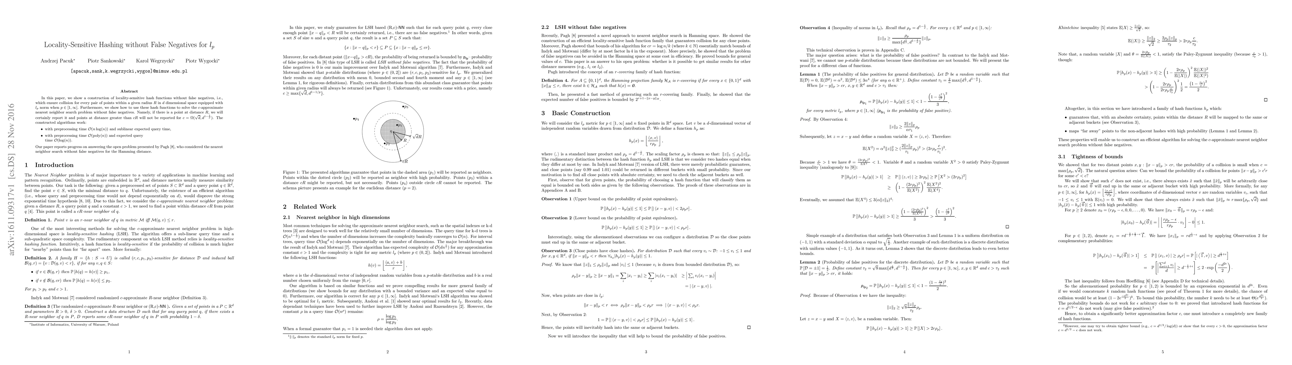 This paper constructs locality-sensitive hash functions ensuring collision for points within a given radius in $l_p$ norm without false negatives, and uses them to solve $c$-approximate nearest neighbor search without false negatives. The algorithms achieve preprocessing times of $\mathcal{O}(n \log(n))$ or $\mathcal{O}(\mathrm{poly}(n))$ and sublinear or $\mathcal{O}(\log(n))$ expected query times.