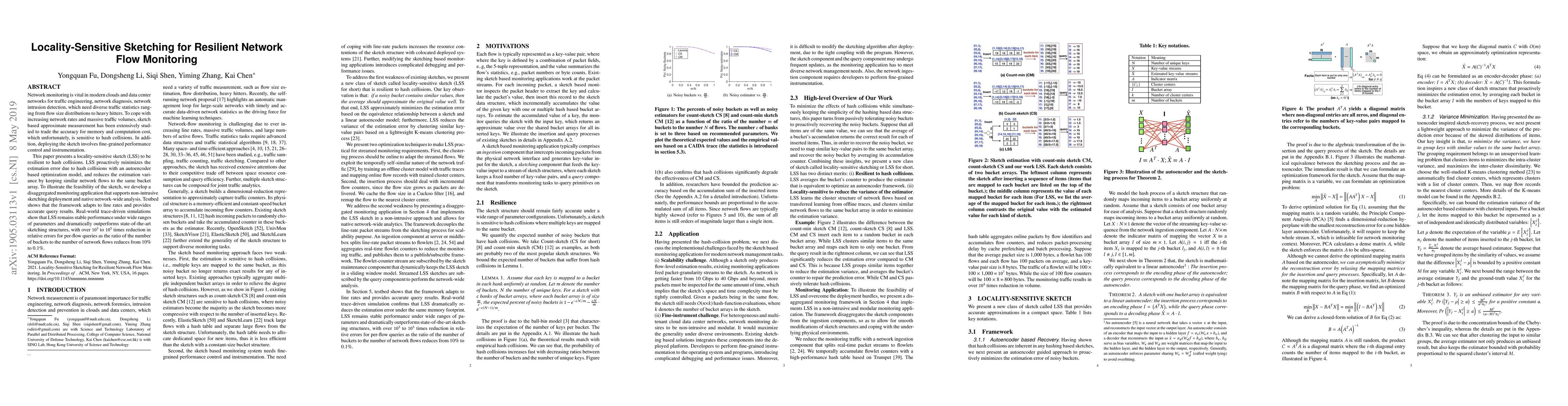 Network monitoring is vital in modern clouds and data center networks for traffic engineering, network diagnosis, network intrusion detection, which need diverse traffic statistics ranging from flow size distributions to heavy hitters. To cope with increasing network rates and massive traffic volumes, sketch based approximate measurement has been extensively studied to trade the accuracy for memory and computation cost, which unfortunately, is sensitive to hash collisions. In addition, deploying the sketch involves fine-grained performance control and instrumentation. This paper presents a locality-sensitive sketch (LSS) to be resilient to hash collisions. LSS proactively minimizes the estimation error due to hash collisions with an autoencoder based optimization model, and reduces the estimation variance by keeping similar network flows to the same bucket array. To illustrate the feasibility of the sketch, we develop a disaggregated monitoring application that supports non-intrusive sketching deployment and native network-wide analysis. Testbed shows that the framework adapts to line rates and provides accurate query results. Real-world trace-driven simulations show that LSS remains stable performance under wide ranges of parameters and dramatically outperforms state-of-the-art sketching structures, with over $10^3$ to $10^5$ times reduction in relative errors for per-flow queries as the ratio of the number of buckets to the number of network flows reduces from 10\% to 0.1\%.