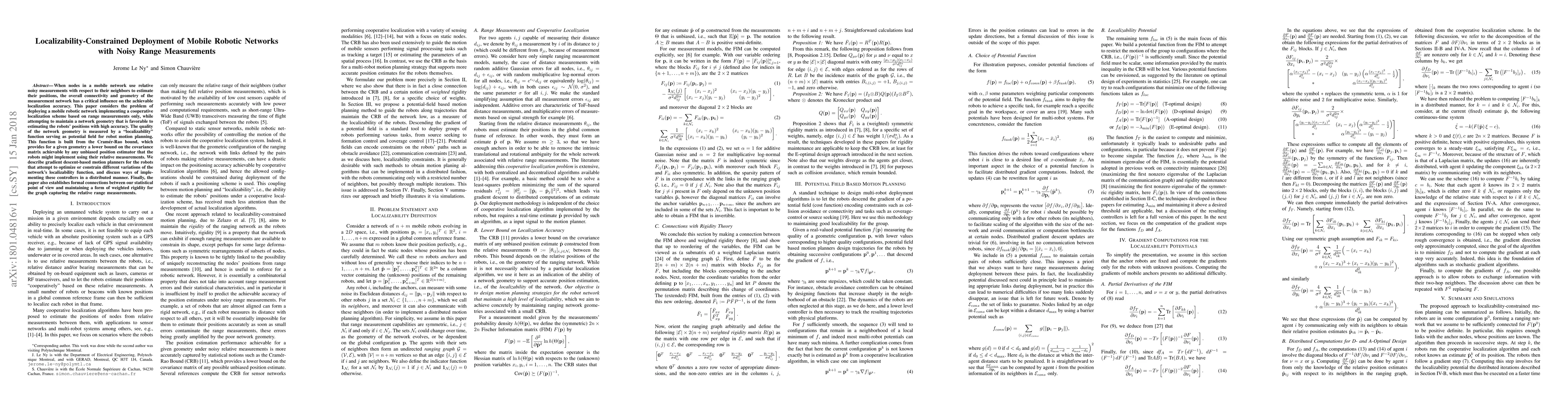 This paper explores deploying mobile robotic networks using noisy range measurements to optimize localization accuracy, focusing on maintaining a favorable network geometry through a "localizability" function derived from the Cramér-Rao bound. It proposes gradient descent-based motion planners for distributed implementation and connects statistical localization to weighted rigidity in the network graph.