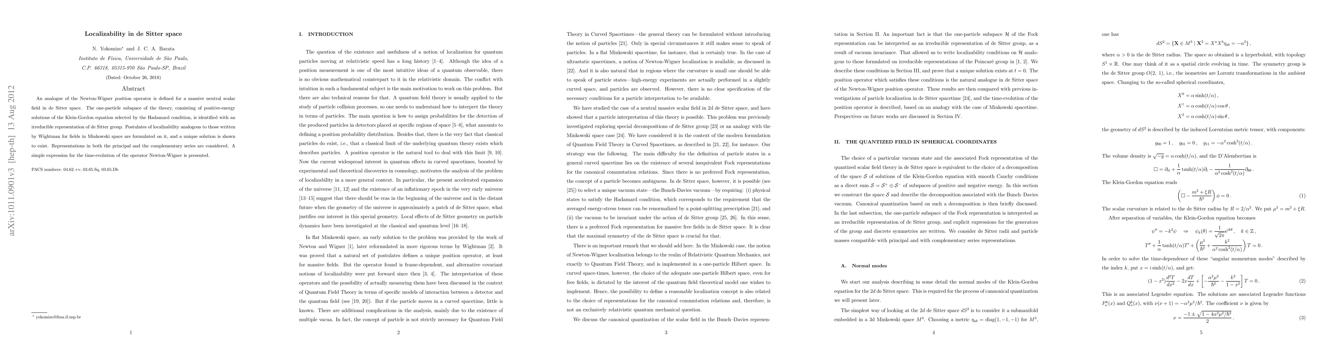 An analogue of the Newton-Wigner position operator is defined for a massive neutral scalar field in de Sitter space. The one-particle subspace of the theory, consisting of positive-energy solutions of the Klein-Gordon equation selected by the Hadamard condition, is identified with an irreducible representation of de Sitter group. Postulates of localizability analogous to those written by Wightman for fields in Minkowski space are formulated on it, and a unique solution is shown to exist. A simple expression for the time-evolution of the operator is presented.