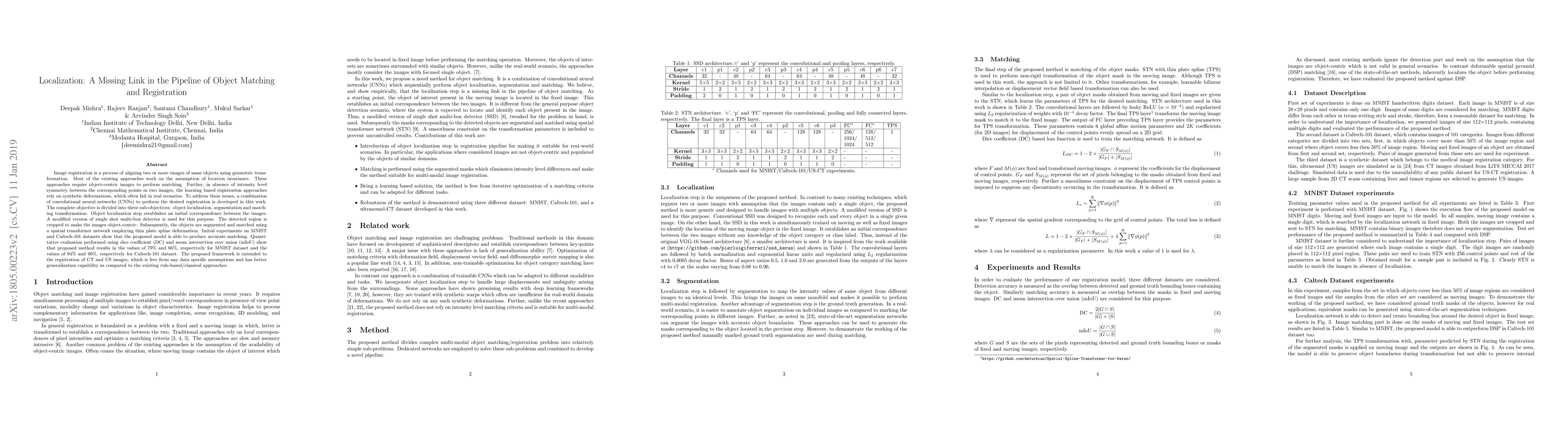 Image registration is a process of aligning two or more images of same objects using geometric transformation. Most of the existing approaches work on the assumption of location invariance. These approaches require object-centric images to perform matching. Further, in absence of intensity level symmetry between the corresponding points in two images, the learning based registration approaches rely on synthetic deformations, which often fail in real scenarios. To address these issues, a combination of convolutional neural networks (CNNs) to perform the desired registration is developed in this work. The complete objective is divided into three sub-objectives: object localization, segmentation and matching transformation. Object localization step establishes an initial correspondence between the images. A modified version of single shot multi-box detector is used for this purpose. The detected region is cropped to make the images object-centric. Subsequently, the objects are segmented and matched using a spatial transformer network employing thin plate spline deformation. Initial experiments on MNIST and Caltech-101 datasets show that the proposed model is able to produce accurate matching. Quantitative evaluation performed using dice coefficient (DC) and mean intersection over union (mIoU) show that proposed method results in the values of 79% and 66%, respectively for MNIST dataset and the values of 94% and 90%, respectively for Caltech-101 dataset. The proposed framework is extended to the registration of CT and US images, which is free from any data specific assumptions and has better generalization capability as compared to the existing rule-based/classical approaches.