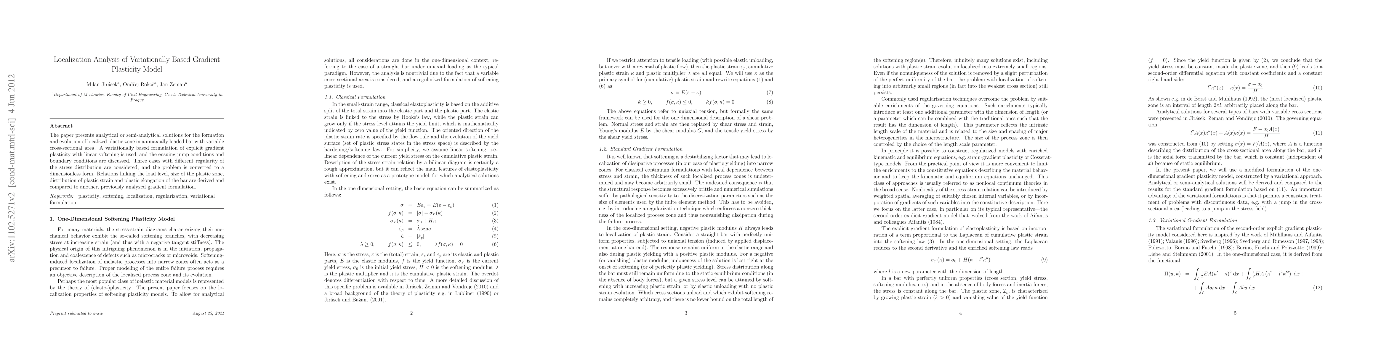Researchers developed analytical solutions for a variationally based gradient plasticity model to study localized plastic zones in uniaxially loaded bars with variable cross-sectional area. They derived relations linking load level, plastic zone size, strain distribution, and bar elongation under different stress distribution regularities.