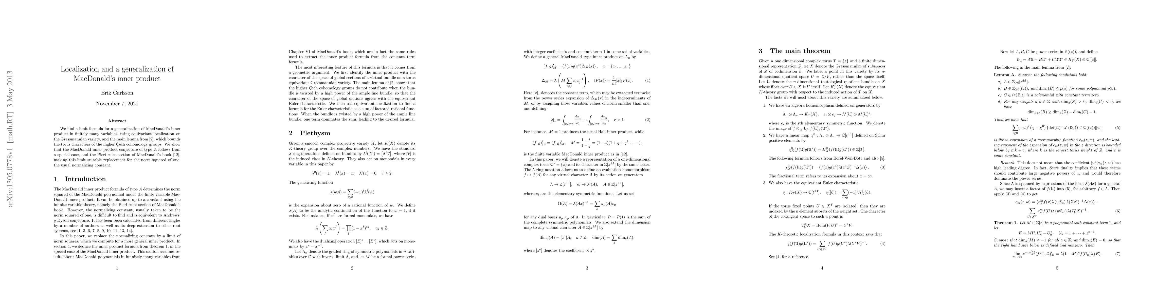 We find a limit formula for a generalization of MacDonald's inner product in finitely many variables, using equivariant localization on the Grassmannian variety, and the main lemma from \cite{Car}, which bounds the torus characters of the higher \c{C}ech cohomology groups. We show that the MacDonald inner product conjecture of type $A$ follows from a special case, and the Pieri rules section of MacDonald's book \cite{Mac}, making this limit suitable replacement for the norm squared of one, the usual normalizing constant.