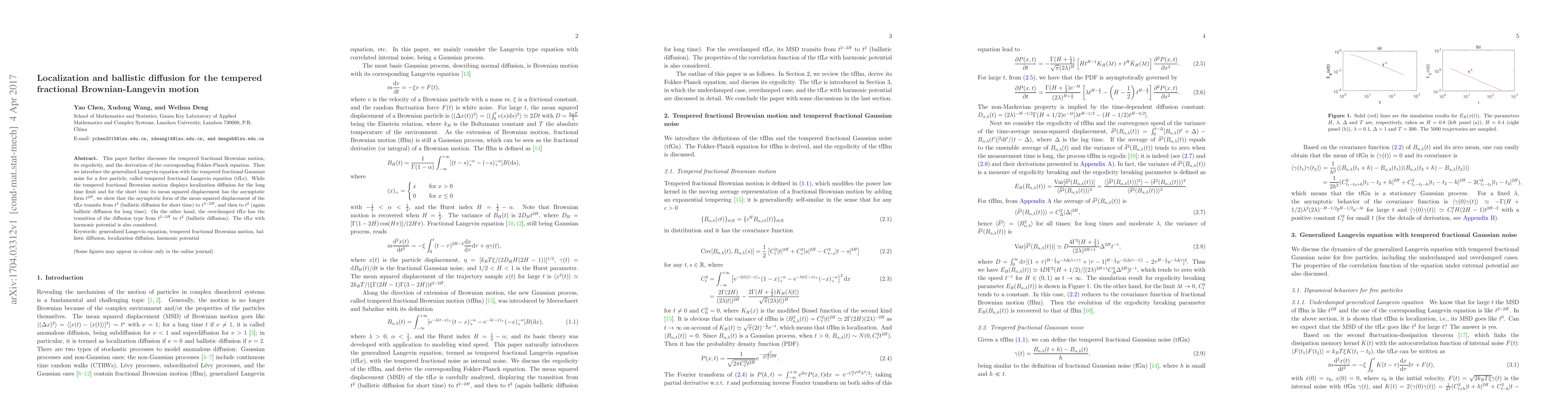 This paper explores the tempered fractional Brownian motion and its ergodicity, and derives the corresponding Fokker-Planck equation. It introduces the tempered fractional Langevin equation (tfLe) and demonstrates transitions in the mean squared displacement from ballistic to localized diffusion, depending on time scale and potential considerations.