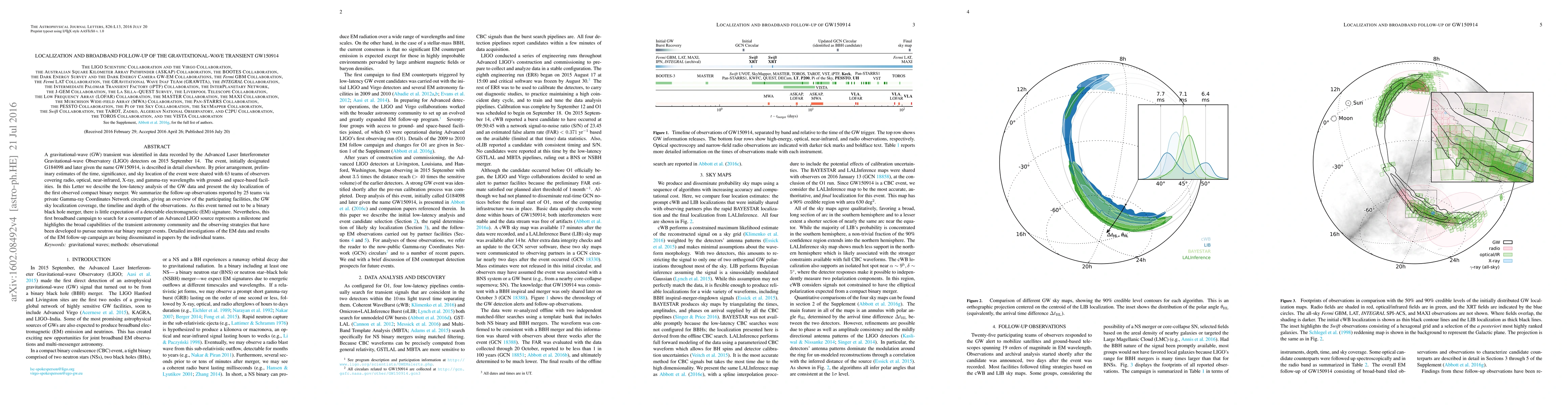 This paper details the low-latency analysis and sky localization of the first gravitational-wave event GW150914, detected by LIGO, and summarizes the subsequent broadband follow-up observations across multiple wavelengths by 63 teams. Despite the low expectation of electromagnetic counterparts due to the event being a binary black hole merger, this marks a significant milestone in the capabilities of the transient astronomy community.