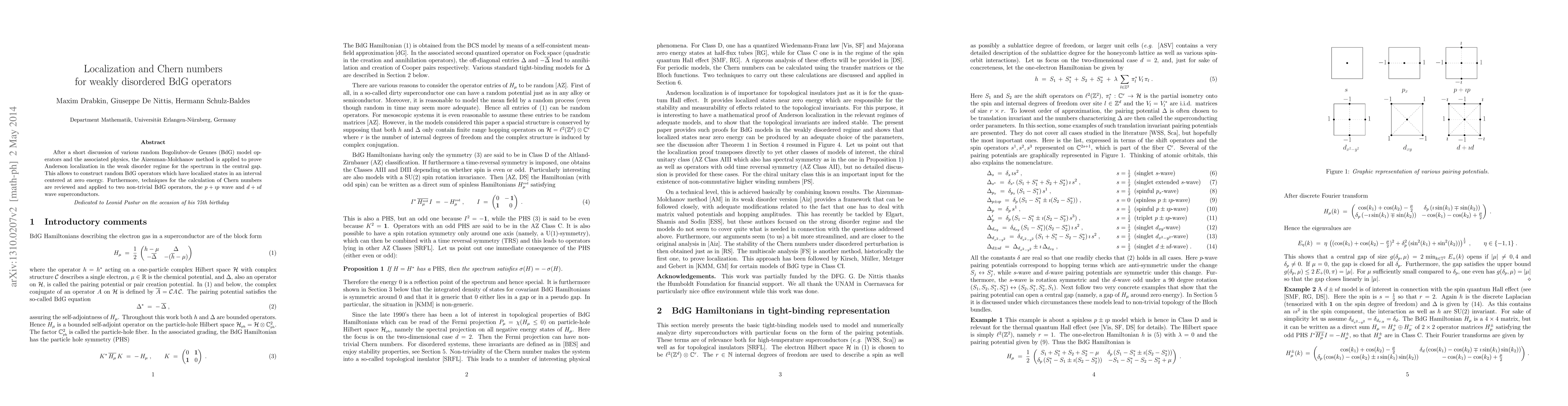 After a short discussion of various random Bogoliubov-de Gennes (BdG) model operators and the associated physics, the Aizenman-Molchanov method is applied to prove Anderson localization in the weak disorder regime for the spectrum in the central gap. This allows to construct random BdG operators which have localized states in an interval centered at zero energy. Furthermore, techniques for the calculation of Chern numbers are reviewed and applied to two non-trivial BdG operators, the p+ip wave and d+id wave superconductors.
