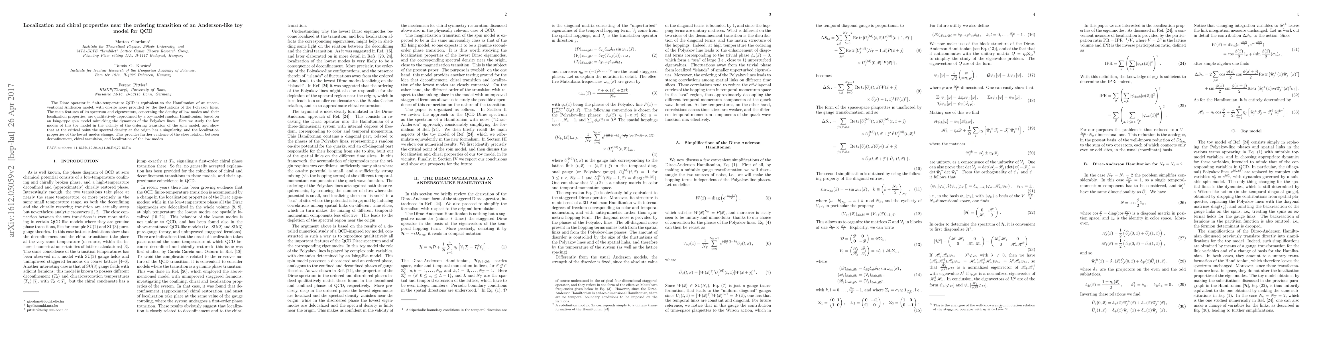 This study investigates the localization and chiral properties of low modes in an Anderson-like toy model for QCD near the ordering transition. The results show a singularity in the spectral density at the critical point and changes in localization, providing evidence of the link between deconfinement, chiral transition, and low mode localization.
