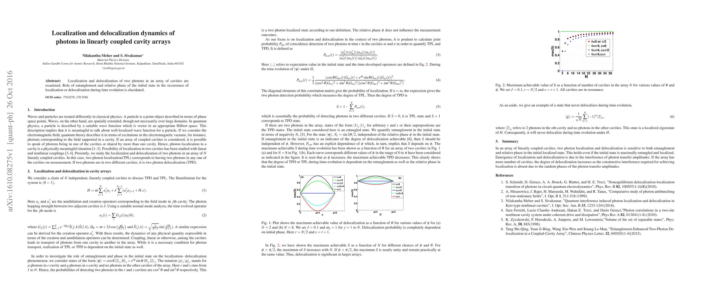 Localization and delocalization of two photons in an array of cavities are examined. Role of entanglement and relative phase of the initial state in the occurrence of localization or delocalization during time evolution is elucidated.