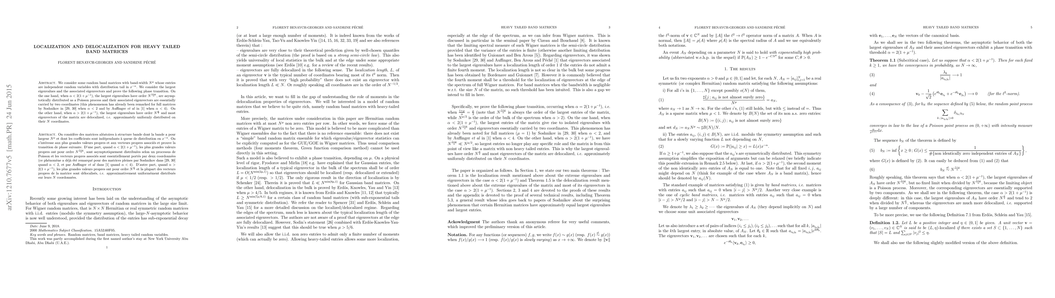 We consider some random band matrices with band-width $N^\mu$ whose entries are independent random variables with distribution tail in $x^{-\alpha}$. We consider the largest eigenvalues and the associated eigenvectors and prove the following phase transition. On the one hand, when $\alpha\textless{}2(1+\mu^{-1})$, the largest eigenvalues have order $N^{(1+\mu)/\alpha}$, are asymptotically distributed as a Poisson process and their associated eigenvectors are essentially carried by two coordinates (this phenomenon has already been remarked by Soshnikov for full matrices with heavy tailed entries,i.e. when $\alpha\textless{}2$, and by Auffinger, Ben Arous and P{\'e}ch{\'e} when $\alpha\textless{}4$). On the other hand, when $\alpha\textgreater{}2(1+\mu^{-1})$, the largest eigenvalues have order $N^{\mu/2}$ and most eigenvectors of the matrix are delocalized, i.e. approximately uniformly distributed on their $N$ coordinates.