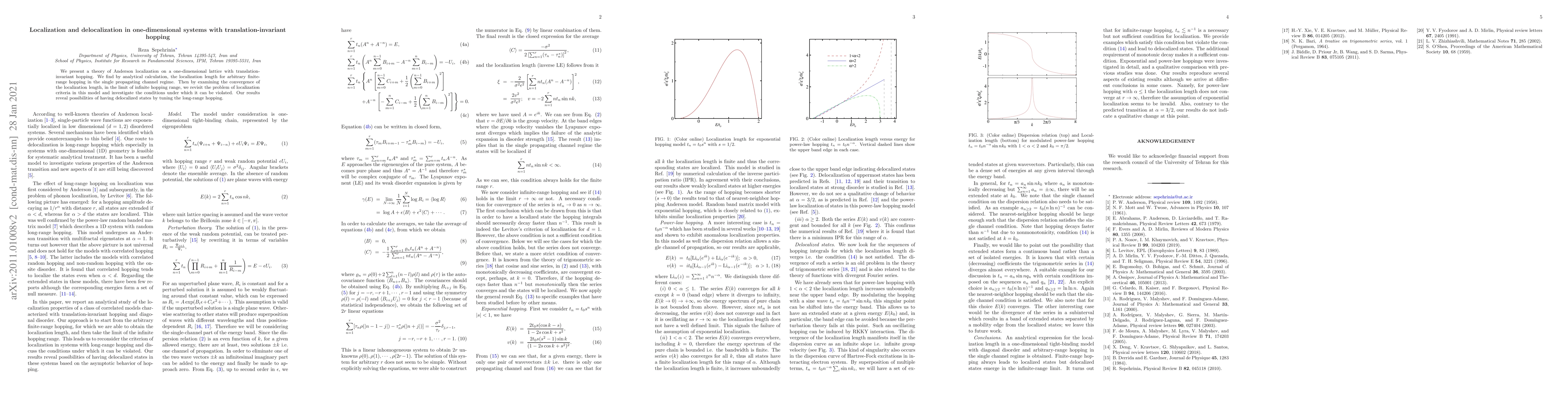 This paper develops a theoretical framework for Anderson localization in one-dimensional lattices with translation-invariant hopping, determining the localization length for finite-range hopping and exploring the conditions under which delocalized states can emerge by adjusting long-range hopping.