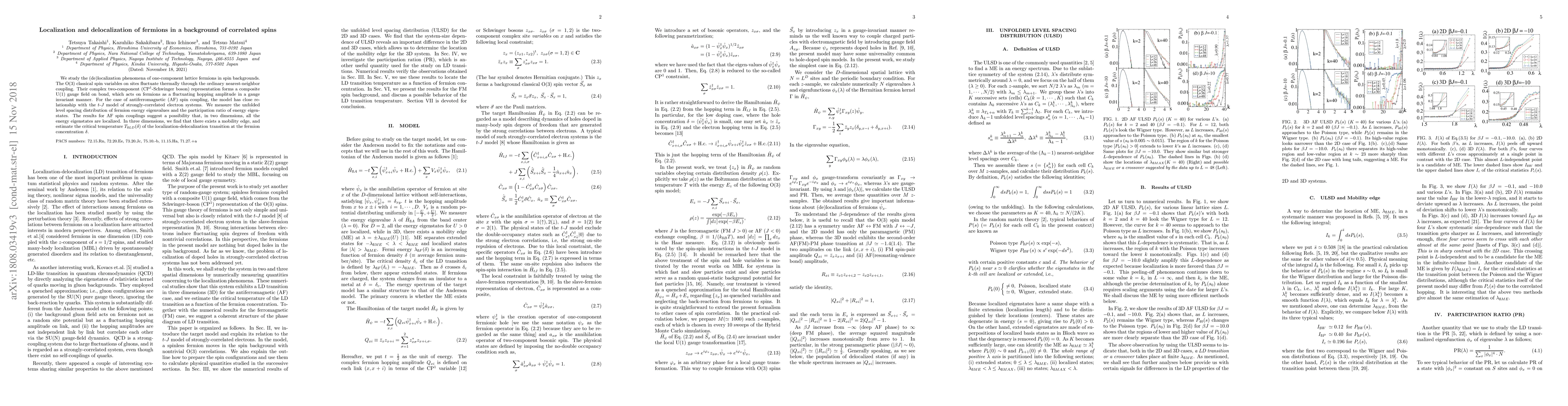 We study the (de)localization phenomena of one-component lattice fermions in spin backgrounds. The O(3) classical spin variables on sites fluctuate thermally through the ordinary nearest-neighbor coupling. Their complex two-component (CP$^1$-Schwinger boson) representation forms a composite U(1) gauge field on bond, which acts on fermions as a fluctuating hopping amplitude in a gauge invariant manner. For the case of antiferromagnetic (AF) spin coupling, the model has close relationship with the $t$-$J$ model of strongly-correlated electron systems. We measure the unfolded level spacing distribution of fermion energy eigenvalues and the participation ratio of energy eigenstates. The results for AF spin couplings suggest a possibility that, in two dimensions, all the energy eigenstates are localized. In three dimensions, we find that there exists a mobility edge, and estimate the critical temperature $T_{\ss LD}(\delta)$ of the localization-delocalization transition at the fermion concentration $\delta$.