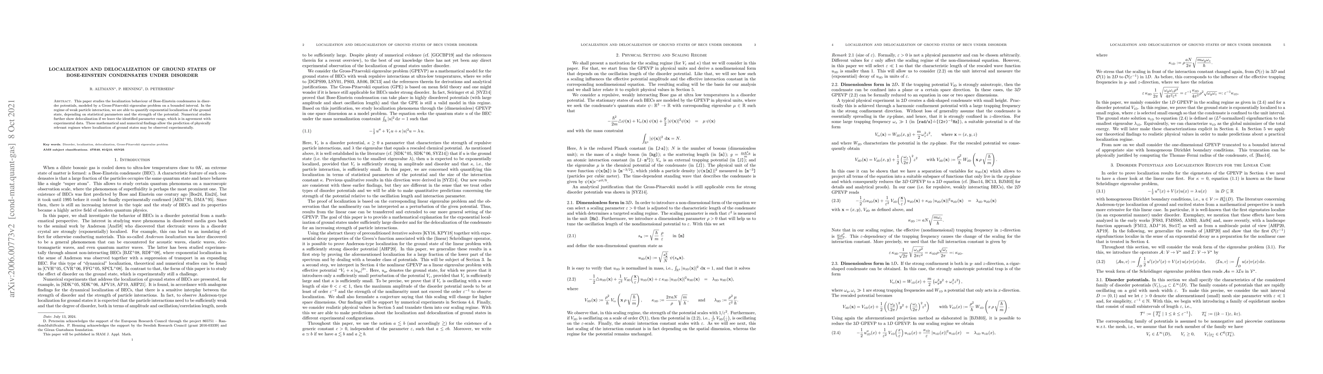 This paper studies the localization behaviour of Bose-Einstein condensates in disorder potentials, modeled by a Gross-Pitaevskii eigenvalue problem on a bounded interval. In the regime of weak particle interaction, we are able to quantify exponential localization of the ground state, depending on statistical parameters and the strength of the potential. Numerical studies further show delocalization if we leave the identified parameter range, which is in agreement with experimental data. These mathematical and numerical findings allow the prediction of physically relevant regimes where localization of ground states may be observed experimentally.