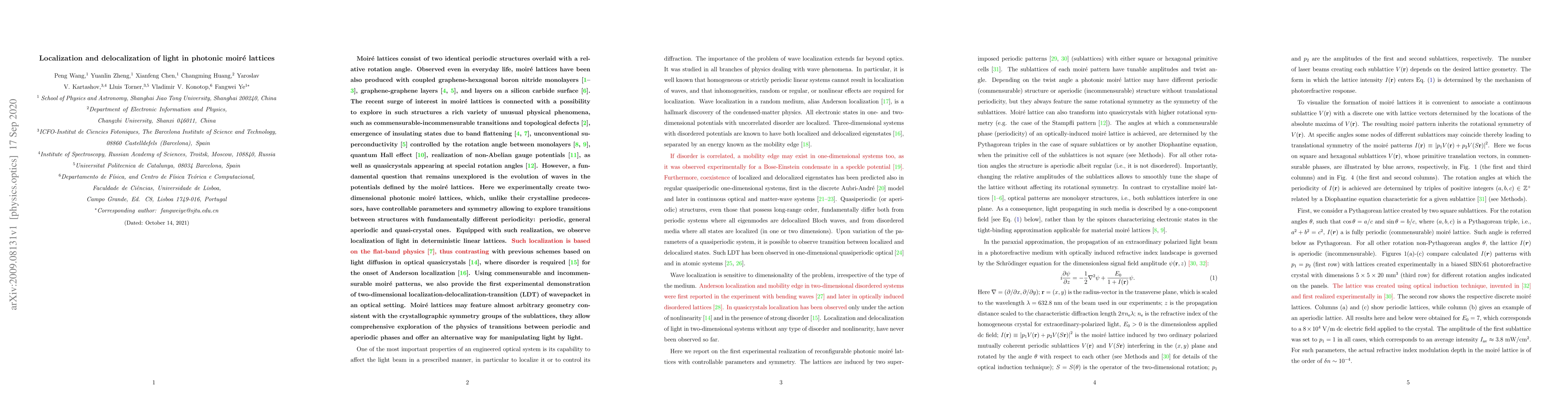 Moire lattices consist of two identical periodic structures overlaid with a relative rotation angle. Present even in everyday life, moire lattices have been also produced, e.g., with coupled graphene-hexagonal boron nitride monolayers, graphene-graphene layers, and layers on a silicon carbide surface.A fundamental question that remains unexplored is the evolution of waves in the potentials defined by the moire lattices. Here we experimentally create two-dimensional photonic moire lattices, which, unlike their material predecessors, have readily controllable parameters and symmetry allowing to explore transitions between structures with fundamentally different geometries: periodic, general aperiodic and quasi-crystal ones. Equipped with such realization, we observe localization of light in deterministic linear lattices. Such localization is based on at band physics, in contrast to previous schemes based on light difusion in optical quasicrystals,where disorder is required for the onset of Anderson localization. Using commensurable and incommensurable moire patterns, we report the first experimental demonstration of two-dimensional localization-delocalization-transition (LDT) of light. Moire lattices may feature almost arbitrary geometry that is consistent with the crystallographic symmetry groups of the sublattices, and therefore afford a powerful tool to control the properties of light patterns, to explore the physics of transitions between periodic and aperiodic phases, and two-dimensional wavepacket phenomena relevant to several areas of science.