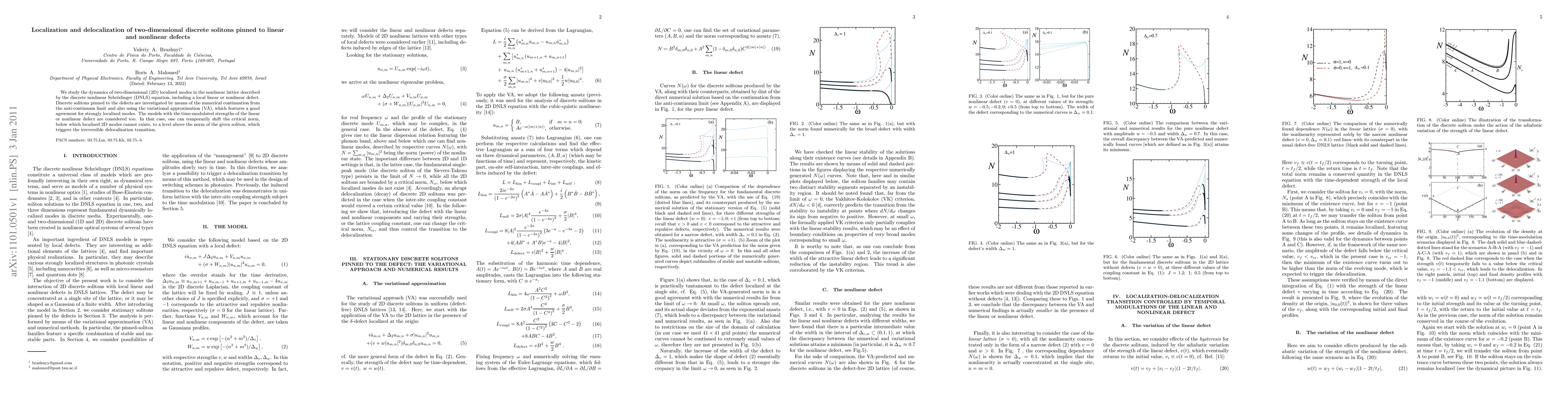 This paper investigates the dynamics of two-dimensional discrete solitons in nonlinear lattices with linear or nonlinear defects, using numerical continuation and variational approximation. It explores how time-modulated defect strengths can trigger irreversible delocalization of these solitons.