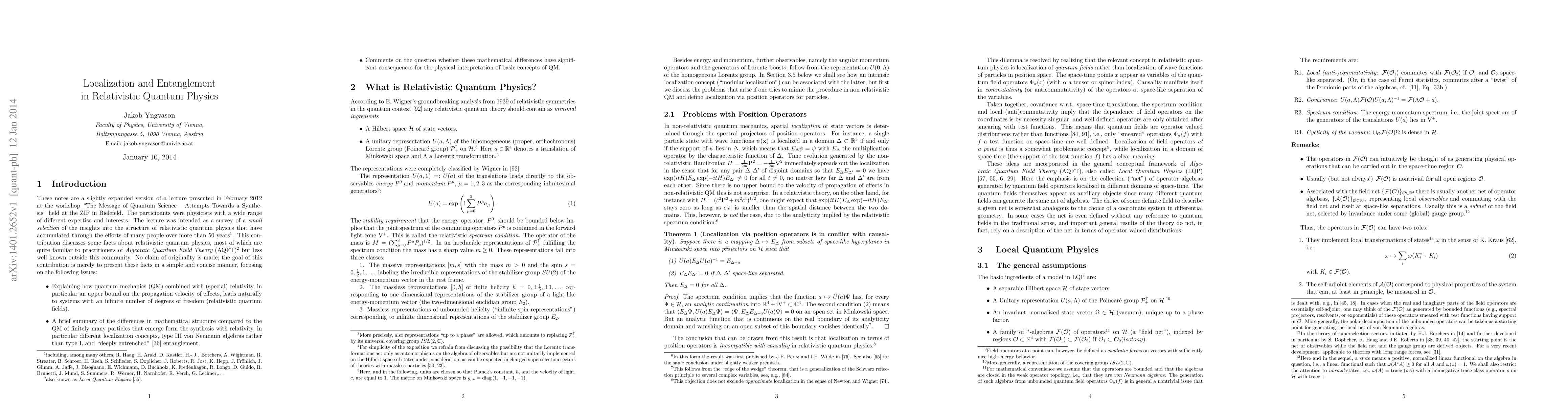 The combination of quantum theory and special relativity leads to structures that differ in several respects from non-relativistic quantum mechanics of particles. These differences are quite familiar to practitioners of Algebraic Quantum Field Theory but less well known outside this community. The paper is intended as a concise survey of some selected aspects of relativistic quantum physics, in particular regarding localization and entanglement.