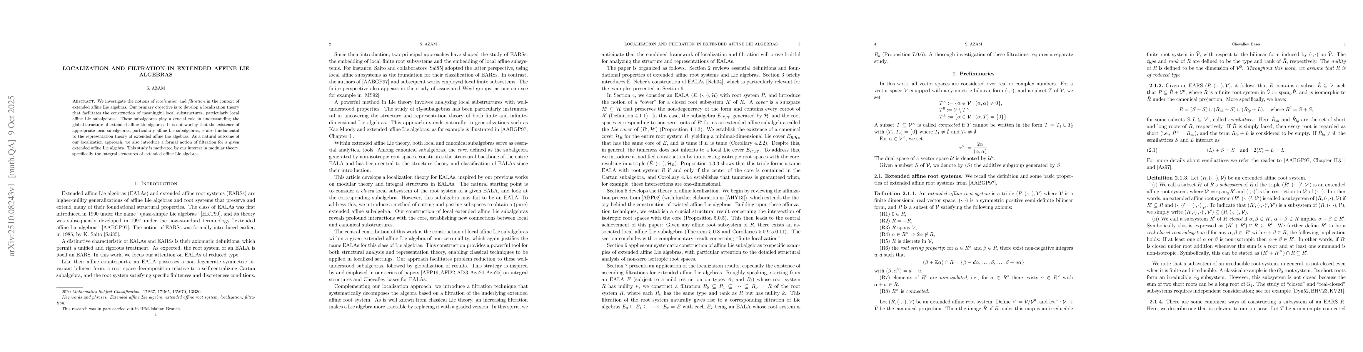 We investigate the notions of \emph{localization} and \emph{filtration} in the context of extended affine Lie algebras. Our primary objective is to develop a localization theory that facilitates the construction of meaningful local substructures, particularly local affine Lie subalgebras. These subalgebras play a crucial role in understanding the global structure of extended affine Lie algebras. It is noteworthy that the existence of appropriate local subalgebras, particularly affine Lie subalgebras, is also fundamental to the representation theory of extended affine Lie algebras. As a natural outcome of our localization approach, we also introduce a formal notion of filtration for a given extended affine Lie algebra. This study is motivated by our interest in modular theory, specifically the integral structures of extended affine Lie algebras.