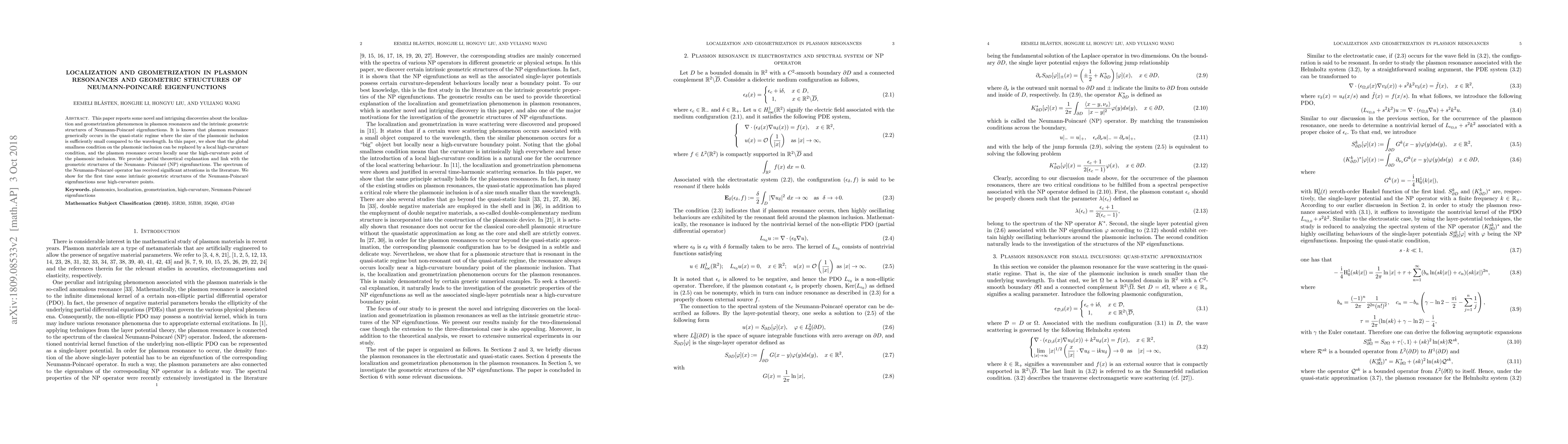 This paper reveals that plasmon resonance can occur locally near high-curvature points rather than globally requiring small inclusion size, and it uncovers intrinsic geometric structures of Neumann-Poincaré eigenfunctions in these regions.