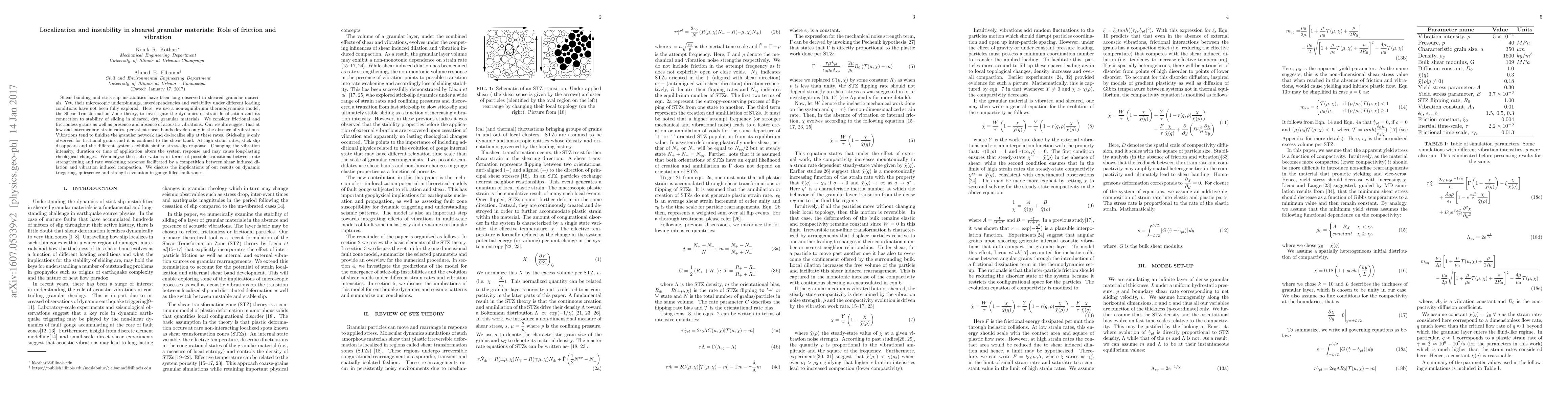 This study explores shear banding and stick-slip instabilities in sheared granular materials using Shear Transformation Zone theory, revealing that vibrations fluidize the material and prevent localized slip at low to intermediate strain rates. At high strain rates, all systems show similar stress-slip responses, and varying vibration conditions can induce long-term rheological changes.