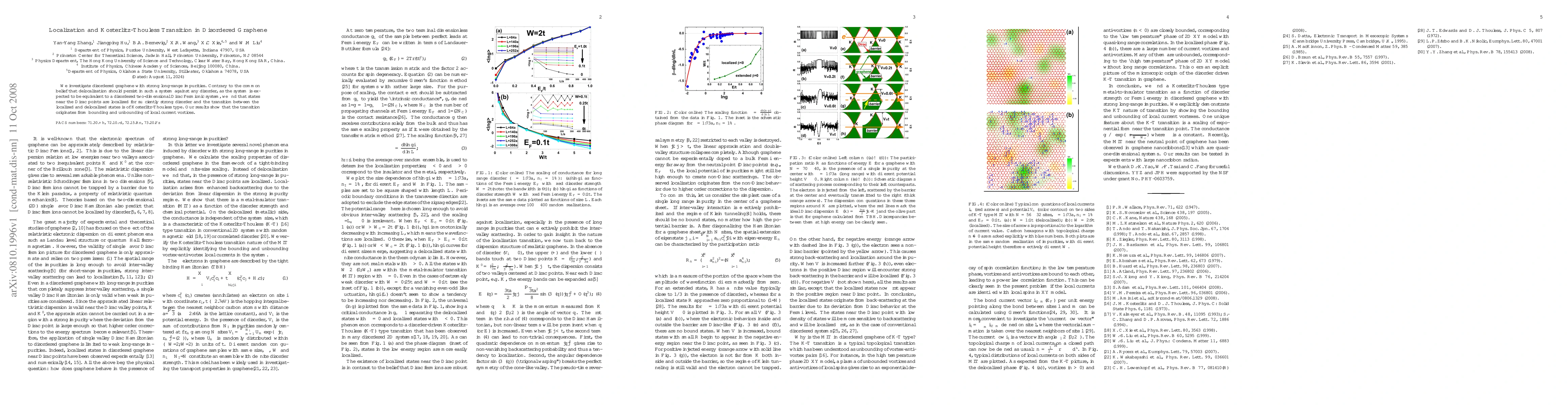 This paper explores disordered graphene with strong long-range impurities, revealing that states near Dirac points localize under sufficient disorder, contrary to common belief. The transition between localized and delocalized states is identified as a Kosterlitz-Thouless type, driven by the formation and annihilation of local current vortices.