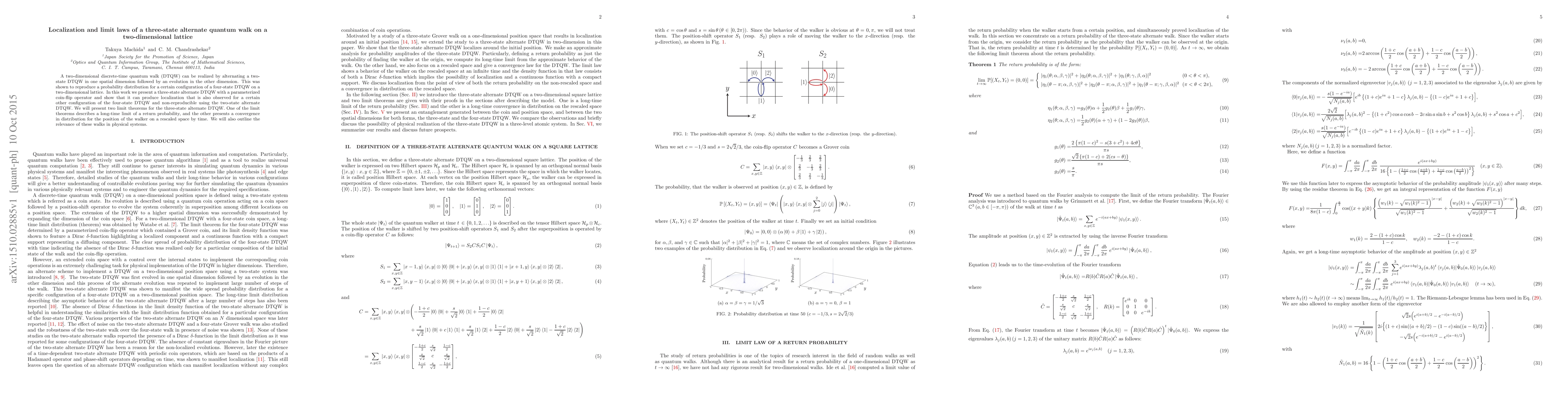 A two-dimensional discrete-time quantum walk (DTQW) can be realized by alternating a two-state DTQW in one spatial dimension followed by an evolution in the other dimension. This was shown to reproduce a probability distribution for a certain configuration of a four-state DTQW on a two-dimensional lattice. In this work we present a three-state alternate DTQW with a parameterized coin-flip operator and show that it can produce localization that is also observed for a certain other configuration of the four-state DTQW and non-reproducible using the two-state alternate DTQW. We will present two limit theorems for the three-state alternate DTQW. One of the limit theorems describes a long-time limit of a return probability, and the other presents a convergence in distribution for the position of the walker on a rescaled space by time. We will also outline the relevance of these walks in physical systems.