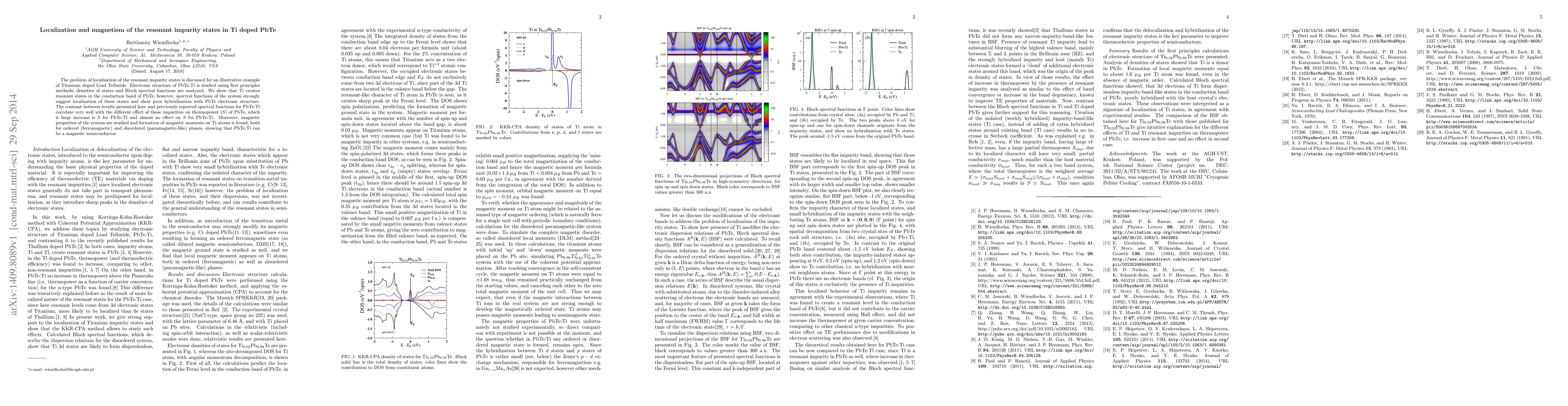 The problem of localization of the resonant impurity states is discussed for an illustrative example of Titanium doped Lead Telluride. Electronic structure of PbTe:Ti is studied using first principles methods, densities of states and Bloch spectral functions are analyzed. We show that Ti creates resonant states in the conduction band of PbTe, however, spectral functions of the system strongly suggest localization of these states and show poor hybridization with PbTe electronic structure. The contrast between results presented here and previously reported spectral functions for PbTe:Tl correlate very well with the different effect of those impurities on thermopower (S) of PbTe, which is large increase is S for PbTe:Tl and almost no effect on S for PbTe:Ti. Moreover, magnetic properties of the system are studied and formation of magnetic moments on Ti atoms is found, both for ordered (ferromagnetic) and disordered (paramagnetic-like) phases, showing that PbTe:Ti can be a magnetic semiconductor.