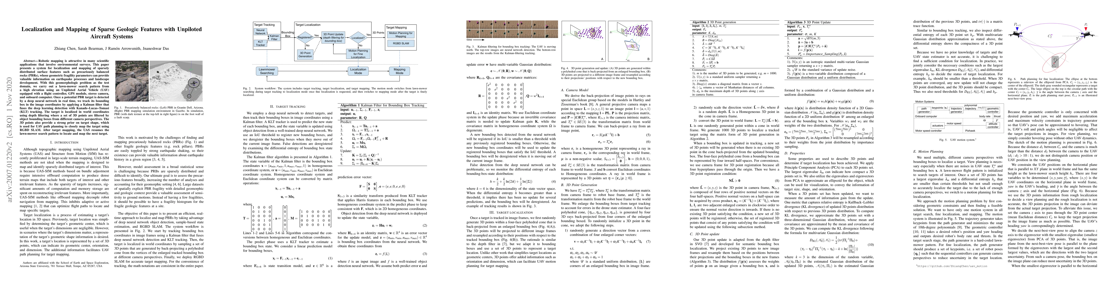 Robotic mapping is attractive in many scientific applications that involve environmental surveys. This paper presents a system for localization and mapping of sparsely distributed surface features such as precariously balanced rocks (PBRs), whose geometric fragility parameters provide valuable information on earthquake processes and landscape development. With this geomorphologic problem as the test domain, we carry out a lawn-mower search pattern from a high elevation using an Unpiloted Aerial Vehicle (UAV) equipped with a flight controller, GPS module, stereo camera, and onboard computer. Once a potential PBR target is detected by a deep neural network in real time, we track its bounding box in the image coordinates by applying a Kalman filter that fuses the deep learning detection with Kanade-Lucas-Tomasi (KLT) tracking. The target is localized in world coordinates using depth filtering where a set of 3D points are filtered by object bounding boxes from different camera perspectives. The 3D points also provide a strong prior on target shape, which is used for UAV path planning to closely map the target using RGBD SLAM. After target mapping, the UAS resumes the lawn-mower search pattern to locate and map the next target.