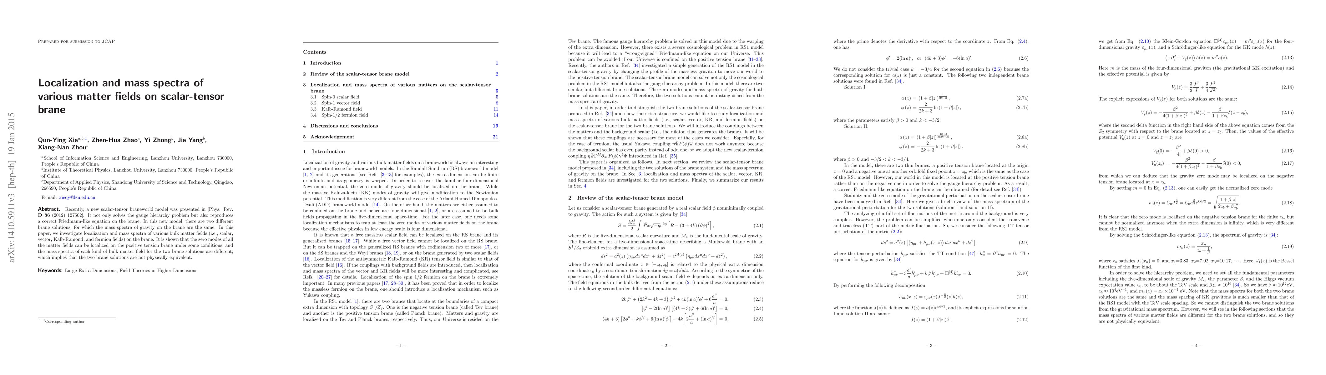 Researchers investigate how various matter fields behave on a brane in a new scalar-tensor braneworld model, finding that zero modes can be localized on the positive tension brane under certain conditions.