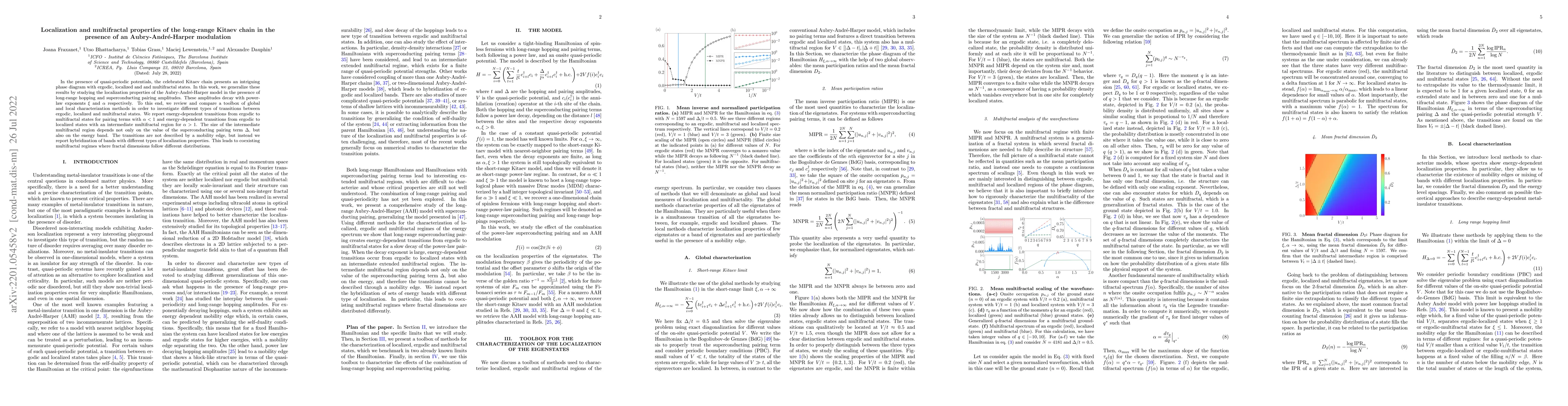 In the presence of quasiperiodic potentials, the celebrated Kitaev chain presents an intriguing phase diagram with ergodic, localized and and multifractal states. In this work, we generalize these results by studying the localization properties of the Aubry-Andr\'e-Harper model in the presence of long-range hopping and superconducting pairing amplitudes. These amplitudes decay with power-law exponents $\xi$ and $\alpha$ respectively. To this end, we review and compare a toolbox of global and local characterization methods in order to investigate different types of transitions between ergodic, localized and multifractal states. We report energy-dependent transitions from ergodic to multifractal states for pairing terms with $\alpha<1$ and energy-dependent transitions from ergodic to localized states with an intermediate multifractal region for $\alpha>1$. The size of the intermediate multifractal region depends not only on the value of the superconducting pairing term $\Delta$, but also on the energy band. The transitions are not described by a mobility edge, but instead we report hybridization of bands with different types of localization properties. This leads to coexisting multifractal regimes where fractal dimensions follow different distributions.