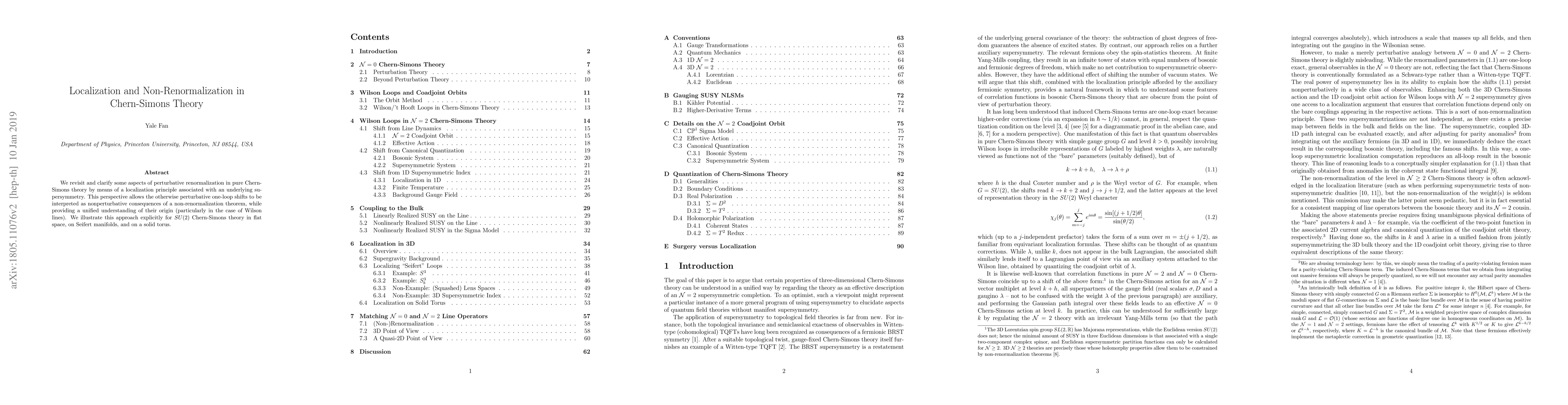 This paper employs localization and supersymmetry to reinterpret perturbative one-loop shifts in pure Chern-Simons theory as nonperturbative consequences, offering a unified understanding and demonstrating this for $SU(2)$ Chern-Simons theory in various spaces.