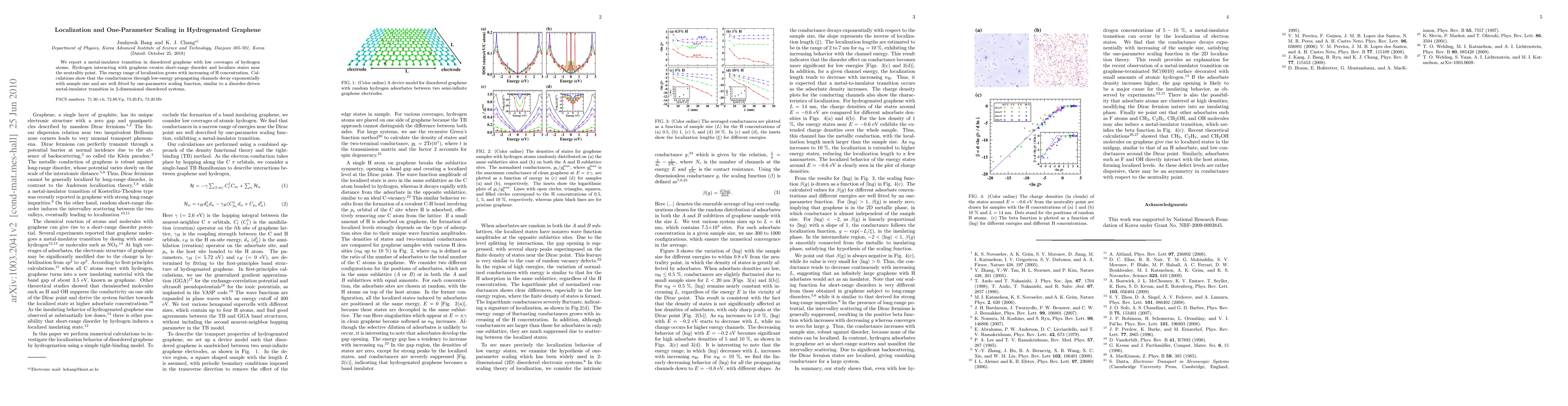 Summary: Disordered graphene with low hydrogen coverage exhibits a metal-insulator transition due to hydrogen-induced localization, with conductance decaying exponentially and fitting a one-parameter scaling function akin to 2D disorder-driven transitions.