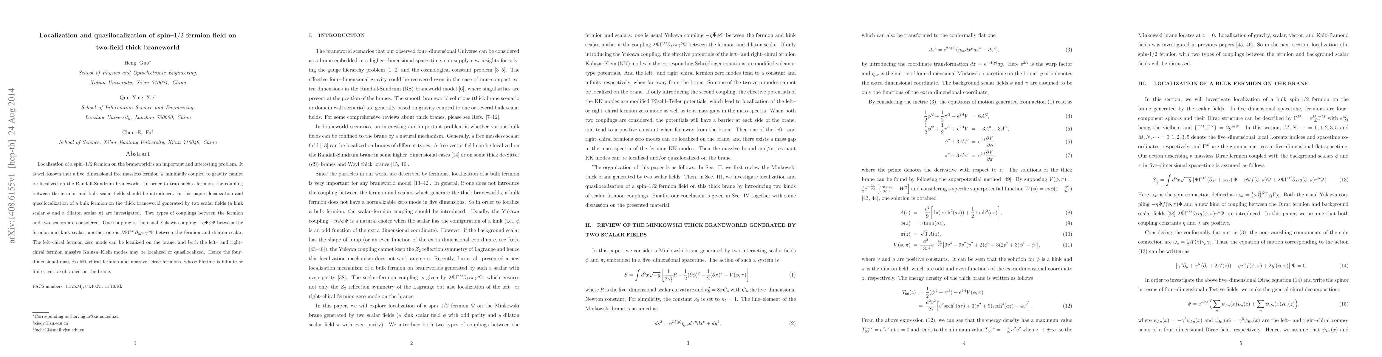This paper investigates the localization and quasilocalization of a spin-$1/2$ fermion on a thick braneworld generated by two scalar fields. It finds that the left-chiral fermion zero mode can be localized, and both left- and right-chiral massive Kaluza-Klein modes can be localized or quasilocalized, enabling the generation of four-dimensional massless left-chiral fermions and massive Dirac fermions.