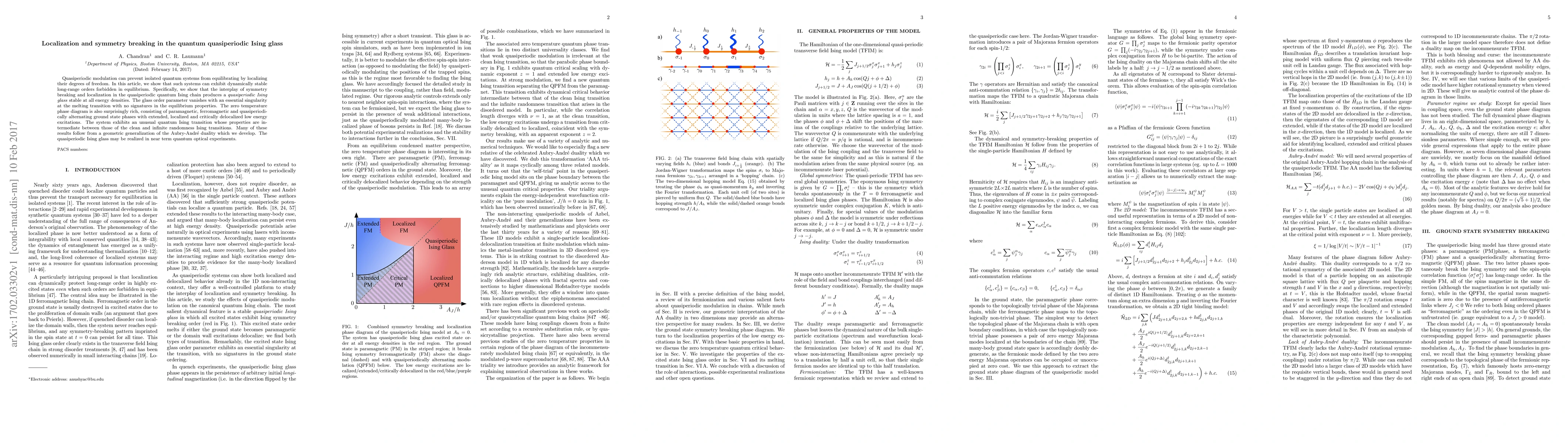 Quasiperiodic modulation can prevent isolated quantum systems from equilibrating by localizing their degrees of freedom. In this article, we show that such systems can exhibit dynamically stable long-range orders forbidden in equilibrium. Specifically, we show that the interplay of symmetry breaking and localization in the quasiperiodic quantum Ising chain produces a \emph{quasiperiodic Ising glass} stable at all energy densities. The glass order parameter vanishes with an essential singularity at the melting transition with no signatures in the equilibrium properties. The zero temperature phase diagram is also surprisingly rich, consisting of paramagnetic, ferromagnetic and quasiperiodically alternating ground state phases with extended, localized and critically delocalized low energy excitations. The system exhibits an unusual quantum Ising transition whose properties are intermediate between those of the clean and infinite randomness Ising transitions. Many of these results follow from a geometric generalization of the Aubry-Andr\'e duality which we develop. The quasiperiodic Ising glass may be realized in near term quantum optical experiments.