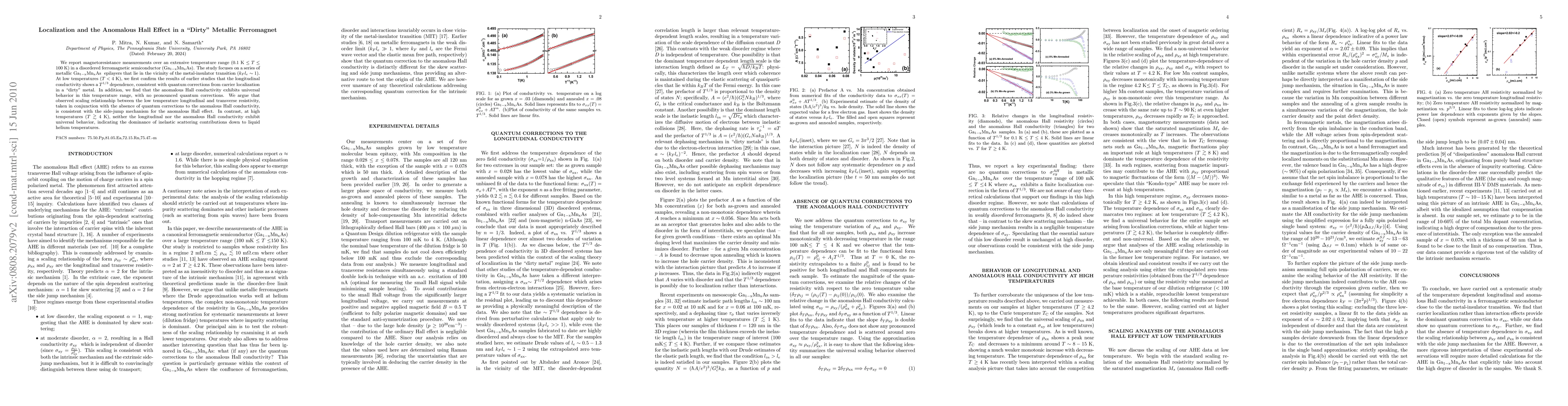 We report magnetoresistance measurements over an extensive temperature range (0.1 K $\leq T \leq$ 100 K) in a disordered ferromagnetic semiconductor (\gma). The study focuses on a series of metallic \gma~ epilayers that lie in the vicinity of the metal-insulator transition ($k_F l_e\sim 1$). At low temperatures ($T < 4$ K), we first confirm the results of earlier studies that the longitudinal conductivity shows a $T^{1/3}$ dependence, consistent with quantum corrections from carrier localization in a ``dirty'' metal. In addition, we find that the anomalous Hall conductivity exhibits universal behavior in this temperature range, with no pronounced quantum corrections. We argue that observed scaling relationship between the low temperature longitudinal and transverse resistivity, taken in conjunction with the absence of quantum corrections to the anomalous Hall conductivity, is consistent with the side-jump mechanism for the anomalous Hall effect. In contrast, at high temperatures ($T \gtrsim 4$ K), neither the longitudinal nor the anomalous Hall conductivity exhibit universal behavior, indicating the dominance of inelastic scattering contributions down to liquid helium temperatures.