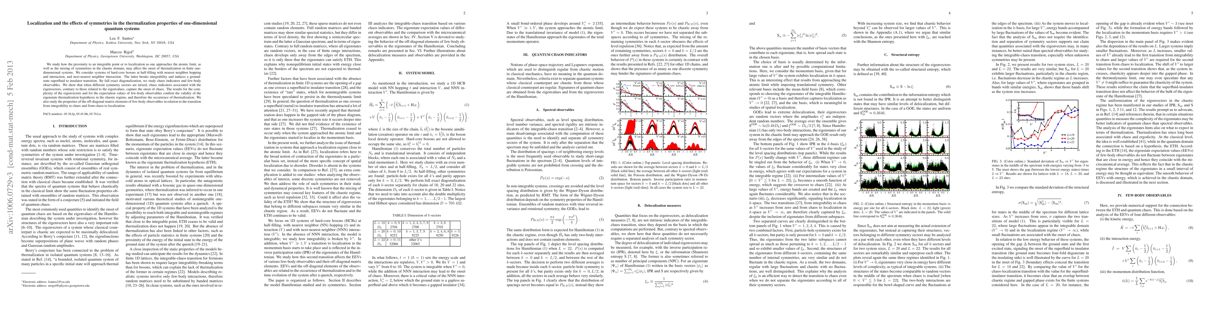 This paper investigates how symmetries and localization influence thermalization in one-dimensional quantum systems, particularly focusing on hard-core bosons. It finds that mixing symmetries enhances chaos indicators linked to eigenvectors, supporting the eigenstate thermalization hypothesis in the chaotic regime.