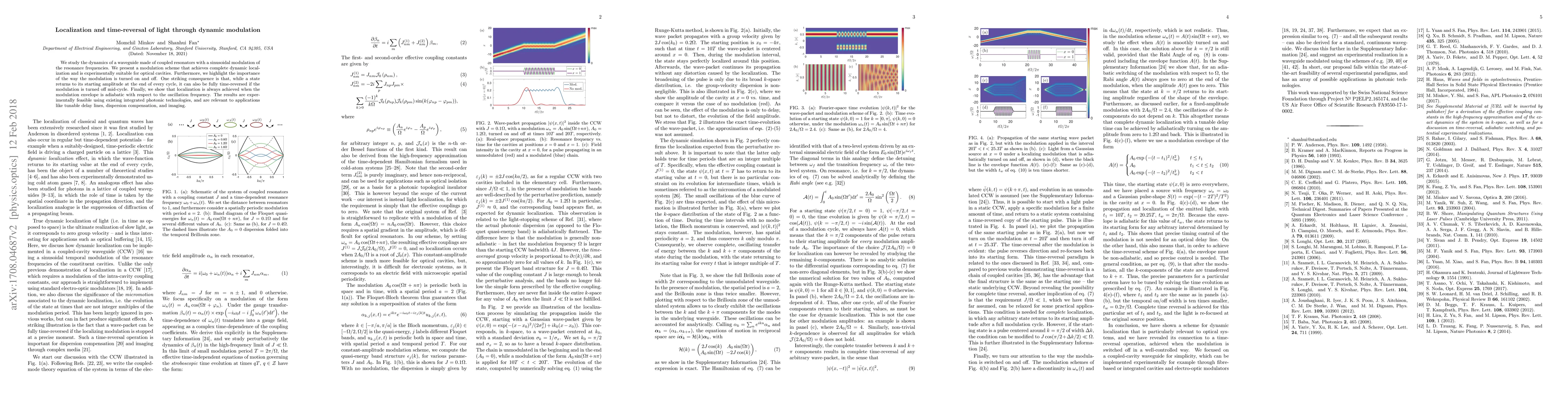 This paper investigates a dynamic modulation scheme in coupled resonator waveguides that achieves complete light localization and time-reversal, demonstrating its experimental feasibility for optical applications. The modulation's adiabatic nature with respect to oscillation frequency ensures localization, and time-reversal can be achieved by stopping modulation mid-cycle.