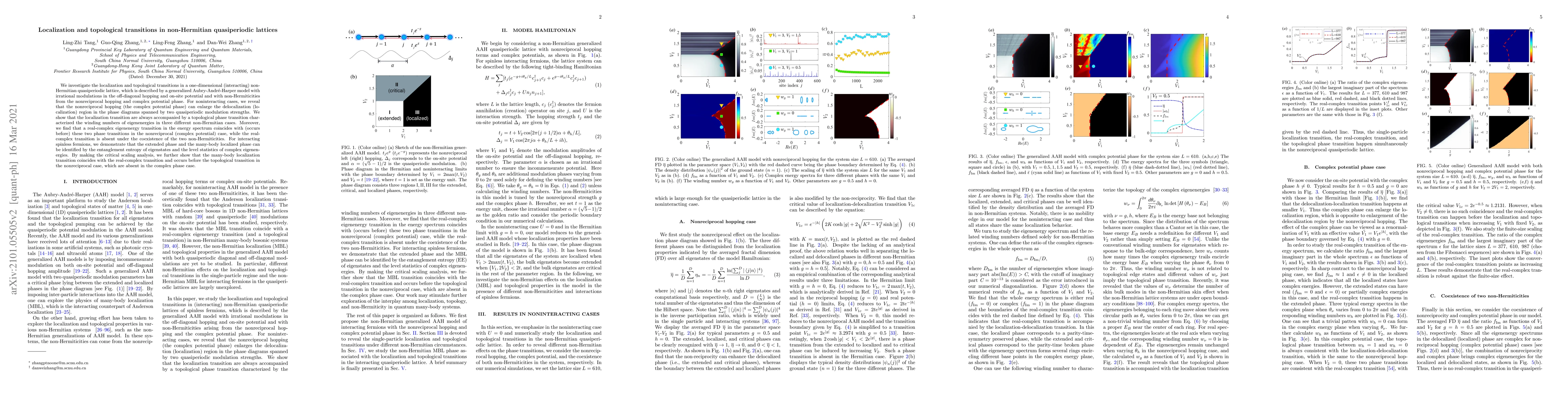 This paper explores localization and topological transitions in a one-dimensional non-Hermitian quasiperiodic lattice described by a generalized Aubry-André-Harper model. It reveals that nonreciprocal hopping can affect localization regions and that topological phase transitions are accompanied by localization transitions, with different behaviors observed under varying non-Hermitian conditions and for interacting fermions.