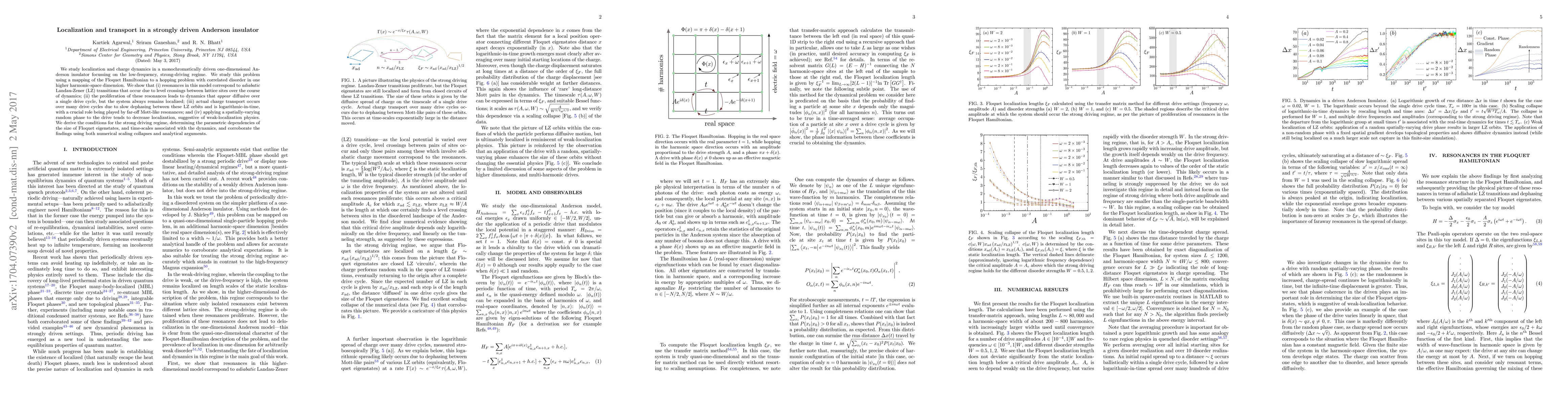 We study localization and charge dynamics in a monochromatically driven one-dimensional Anderson insulator focussing on the low-frequency, strong-driving regime. We study this problem using a mapping of the Floquet Hamiltonian to a hopping problem with correlated disorder in one higher harmonic-space dimension. We show that (i) resonances in this model correspond to \emph{adiabatic} Landau-Zener (LZ) transitions that occur due to level crossings between lattice sites over the course of dynamics; (ii) the proliferation of these resonances leads to dynamics that \emph{appear} diffusive over a single drive cycle, but the system always remains localized; (iii) actual charge transport occurs over many drive cycles due to slow dephasing between these LZ orbits and is logarithmic-in-time, with a crucial role being played by far-off Mott-like resonances; and (iv) applying a spatially-varying random phase to the drive tends to decrease localization, suggestive of weak-localization physics. We derive the conditions for the strong driving regime, determining the parametric dependencies of the size of Floquet eigenstates, and time-scales associated with the dynamics, and corroborate the findings using both numerical scaling collapses and analytical arguments.