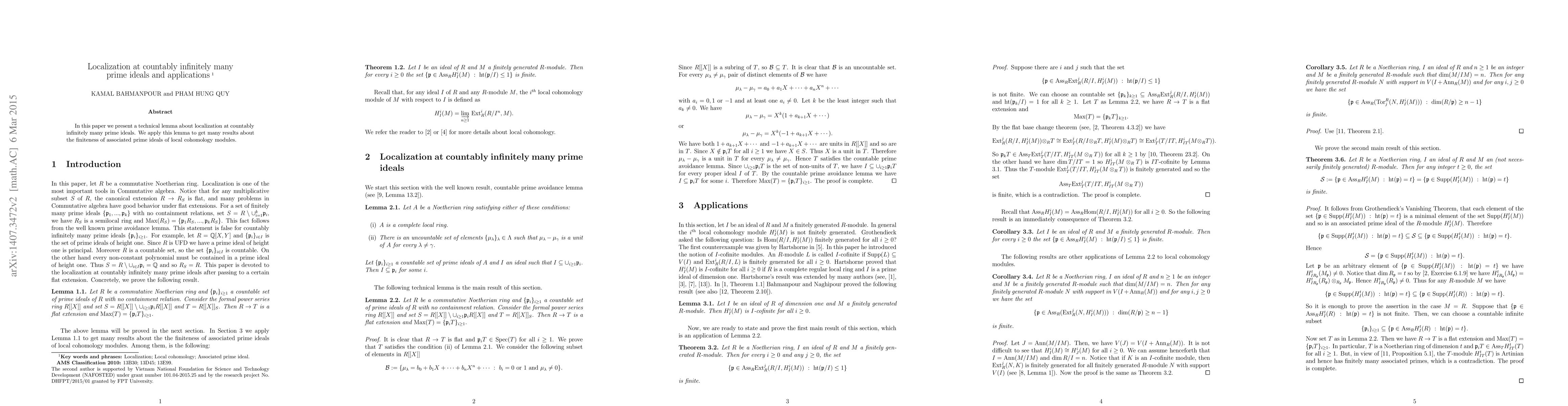 This paper introduces a technical lemma regarding localization at countably infinitely many prime ideals and utilizes it to demonstrate the finiteness of associated prime ideals of local cohomology modules. The results have implications for the structure of local cohomology.