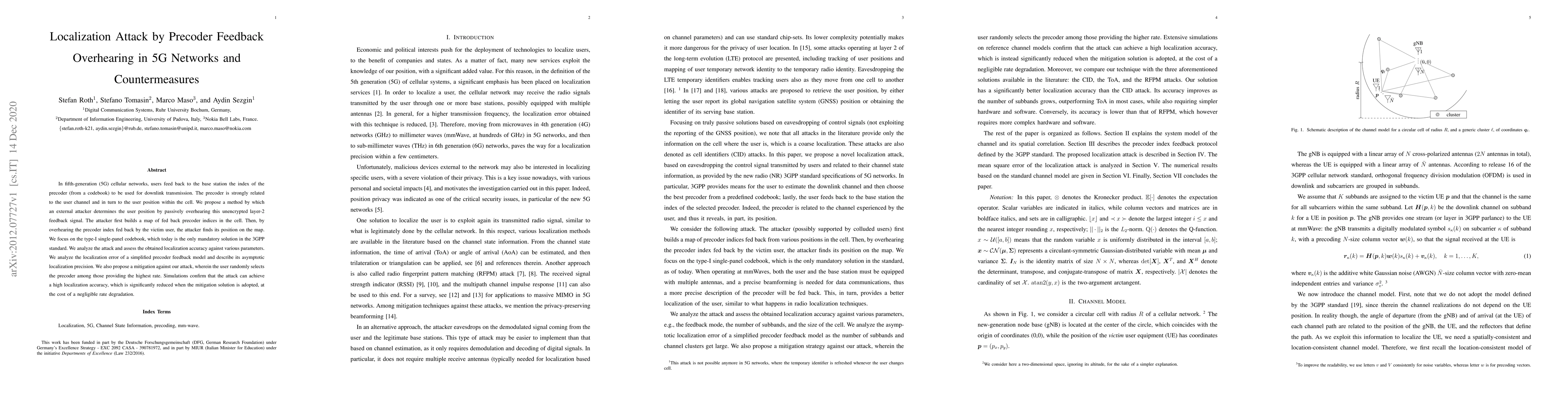 In fifth-generation (5G) cellular networks, users feed back to the base station the index of the precoder (from a codebook) to be used for downlink transmission. The precoder is strongly related to the user channel and in turn to the user position within the cell. We propose a method by which an external attacker determines the user position by passively overhearing this unencrypted layer-2 feedback signal. The attacker first builds a map of fed back precoder indices in the cell. Then, by overhearing the precoder index fed back by the victim user, the attacker finds its position on the map. We focus on the type-I single-panel codebook, which today is the only mandatory solution in the 3GPP standard. We analyze the attack and assess the obtained localization accuracy against various parameters. We analyze the localization error of a simplified precoder feedback model and describe its asymptotic localization precision. We also propose a mitigation against our attack, wherein the user randomly selects the precoder among those providing the highest rate. Simulations confirm that the attack can achieve a high localization accuracy, which is significantly reduced when the mitigation solution is adopted, at the cost of a negligible rate degradation.