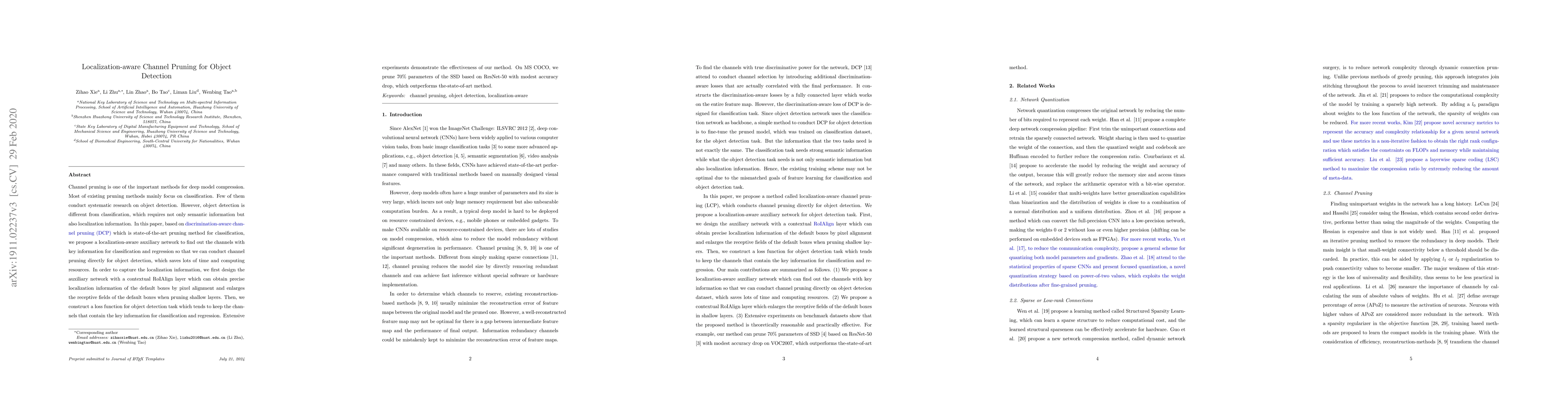 This paper proposes a localization-aware channel pruning method for object detection, enhancing the discrimination-aware channel pruning (DCP) technique. It introduces an auxiliary network with a contextual ROIAlign layer to capture precise localization information, enabling efficient pruning that maintains classification and regression performance, achieving significant parameter reduction with minimal accuracy loss on MS COCO.
