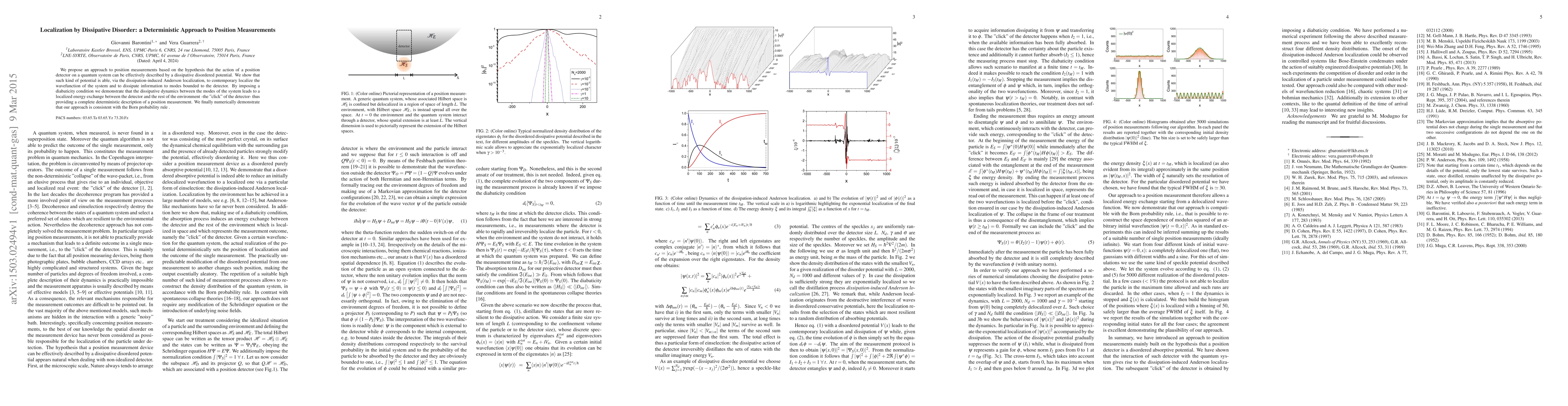 We propose an approach to position measurements based on the hypothesis that the action of a position detector on a quantum system can be effectively described by a dissipative disordered potential. We show that such kind of potential is able, via the dissipation-induced Anderson localization, to contemporary localize the wavefunction of the system and to dissipate information to modes bounded to the detector. By imposing a diabaticity condition we demonstrate that the dissipative dynamics between the modes of the system leads to a localized energy exchange between the detector and the rest of the environment -the "click" of the detector- thus providing a complete deterministic description of a position measurement. We finally numerically demonstrate that our approach is consistent with the Born probability rule.