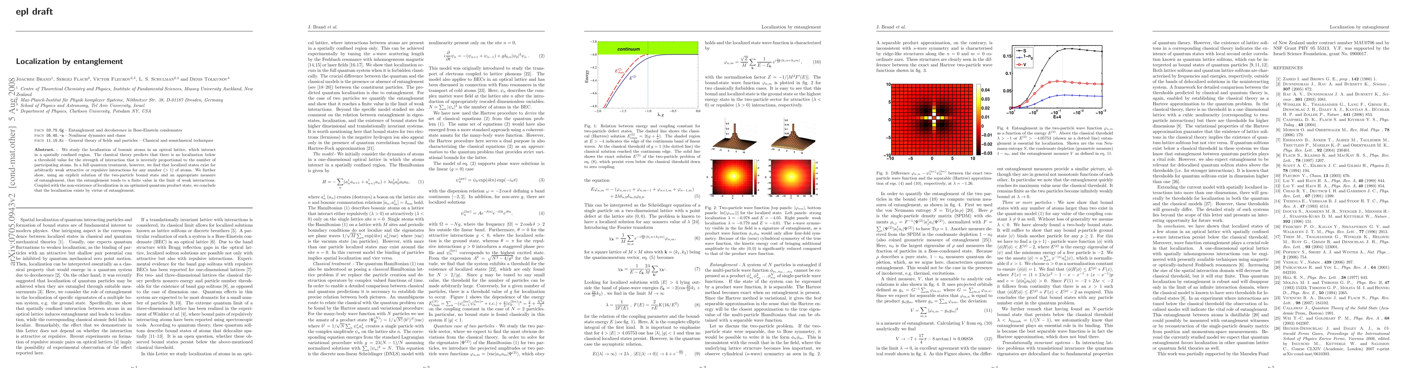 This paper investigates the localization of bosonic atoms in an optical lattice, revealing that quantum effects enable localization even for weak interactions, contrary to classical predictions. The study demonstrates that entanglement plays a crucial role in this phenomenon, as localized states emerge due to the presence of entanglement rather than the strength of interactions.